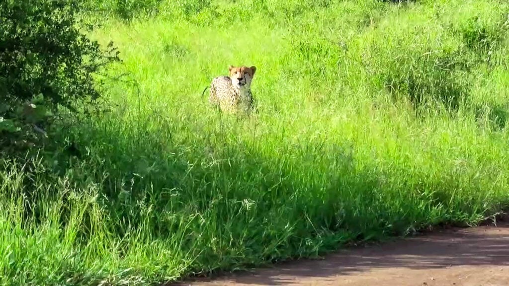 It was a beautiful sunny day out on the S28 in Kruger National Park, when field guide Steyn Jacobsohn took his guests on a drive in search of a group of male cheetahs he knew to be in the area. After driving a short distance down the road, they encountered one of the males standing in the middle of the road.