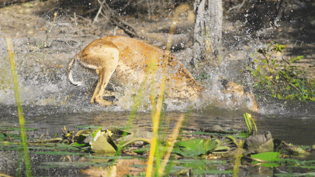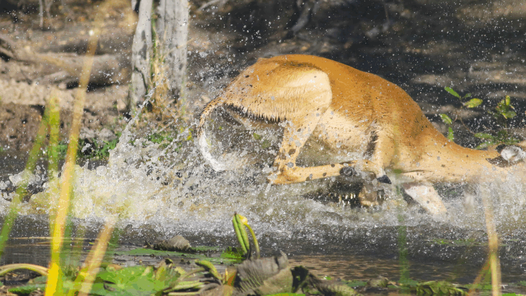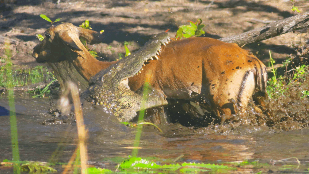 The attack was over within just seconds. The croc’s jaws had bone-crushing power, and the panicked antelope stood no chance. With the crocodile’s grip unyielding, the buck grew limp.