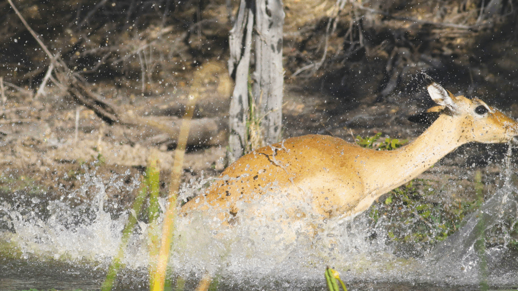 This impala had not anticipated that a crocodile was lurking nearby. When the croc made its presence known, the impala showed its surprise by leaping away from the predator with large splashes.