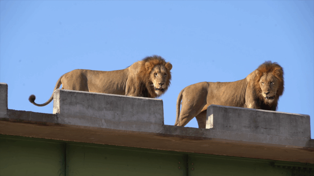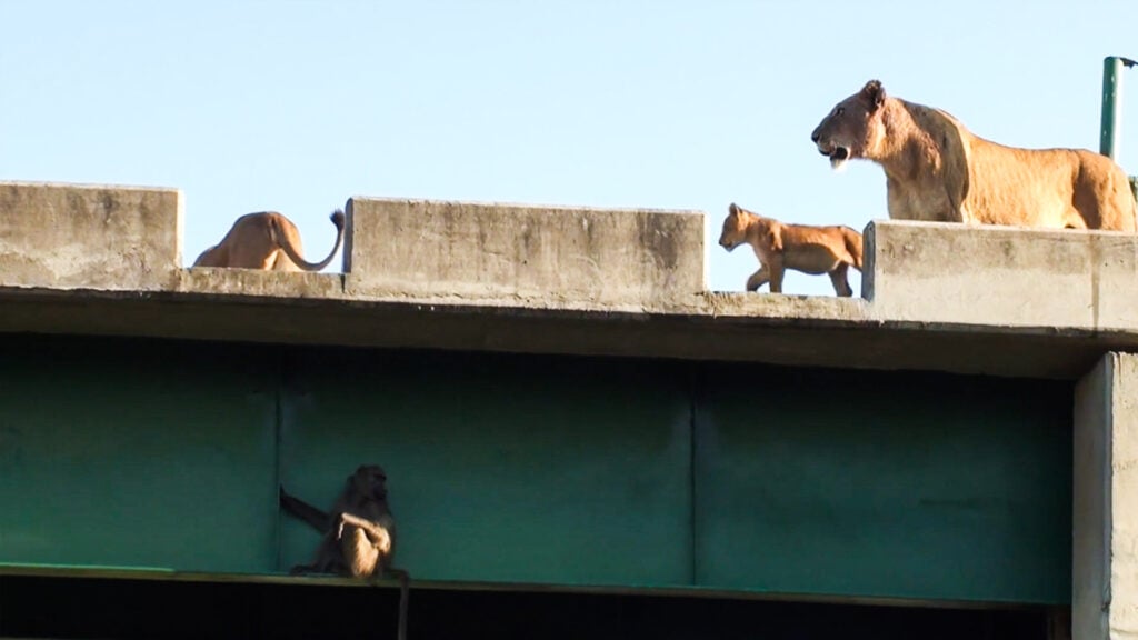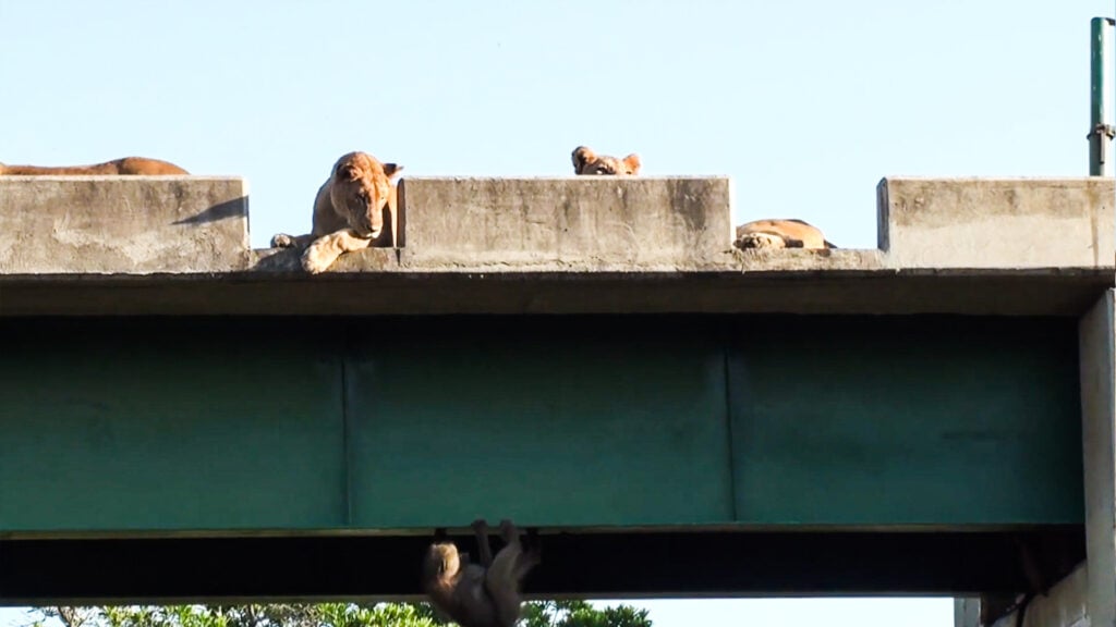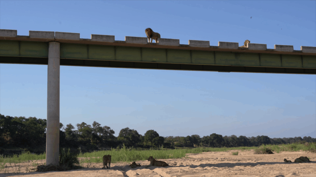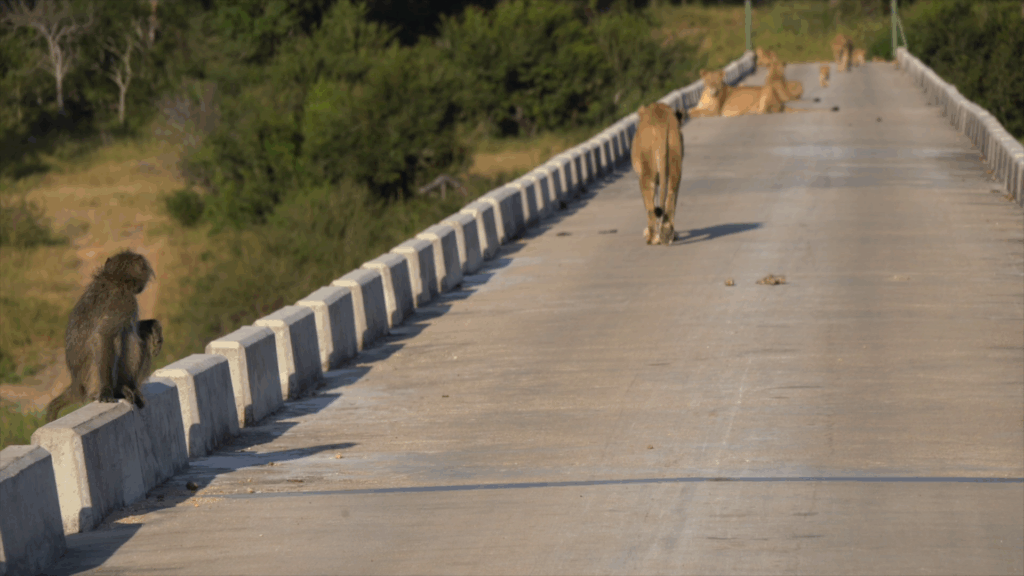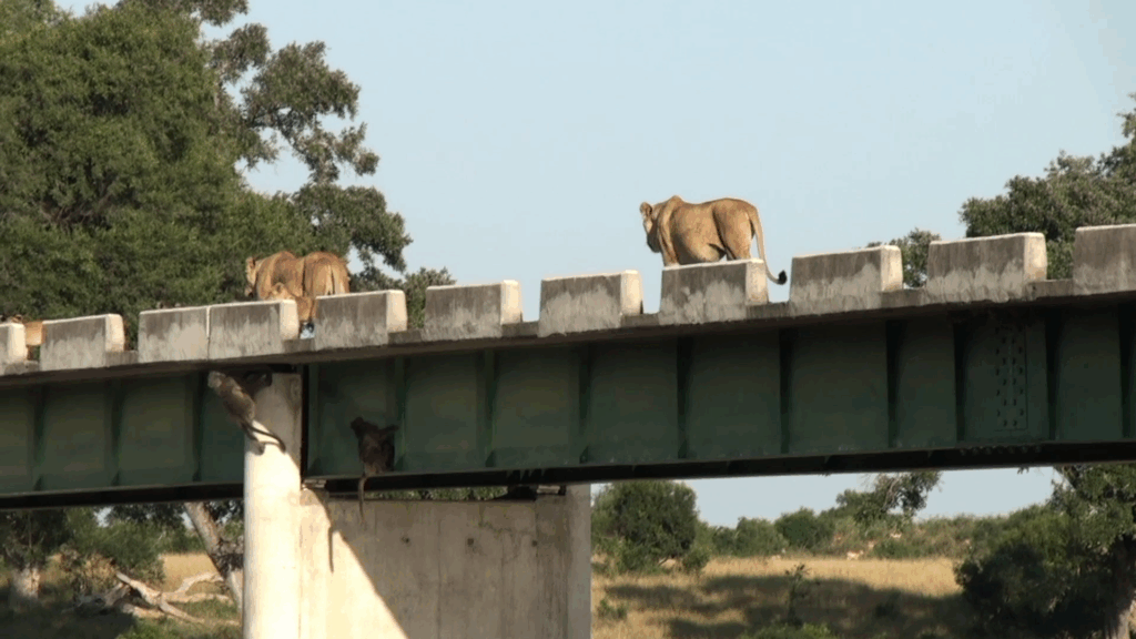 Lagging behind the pride, the pride’s males followed their scent onto the bridge. However, now it was their turn to be confused when they couldn’t find the females. While the male lions looked for their family, the baboons made haste in the opposite direction.