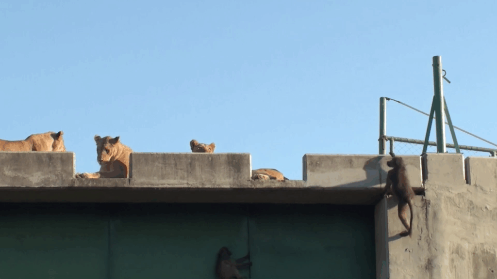 One of the young males seems particularly frustrated by the baboon’s close proximity, leaning over the edge and snarling.