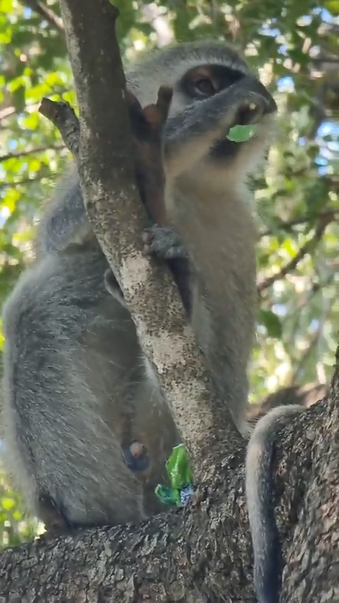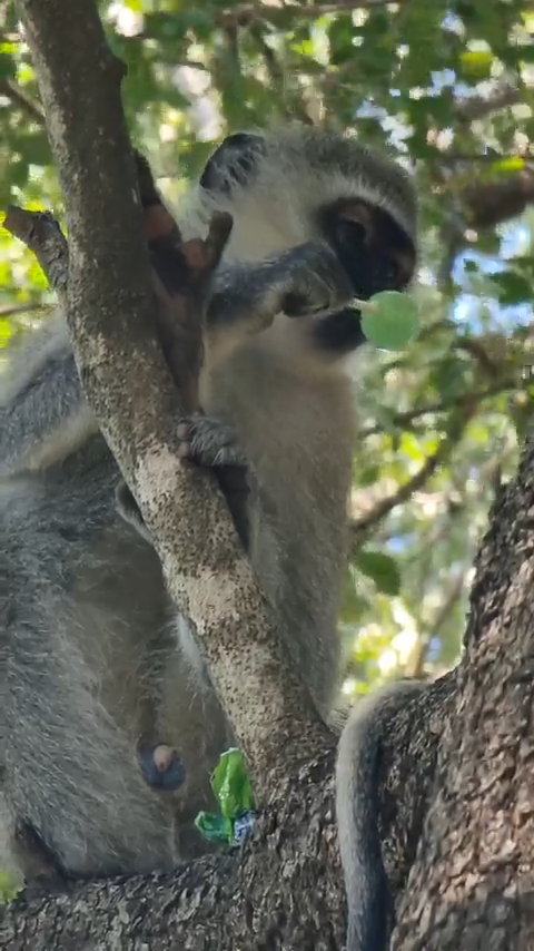For the monkey which Cheri Marks spotted in Afsaal in the Kruger National Park, it had been a very profitable day indeed, presumably to the detriment of some poor and heartbroken child somewhere else in the park.