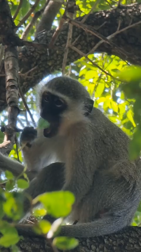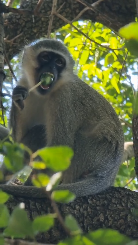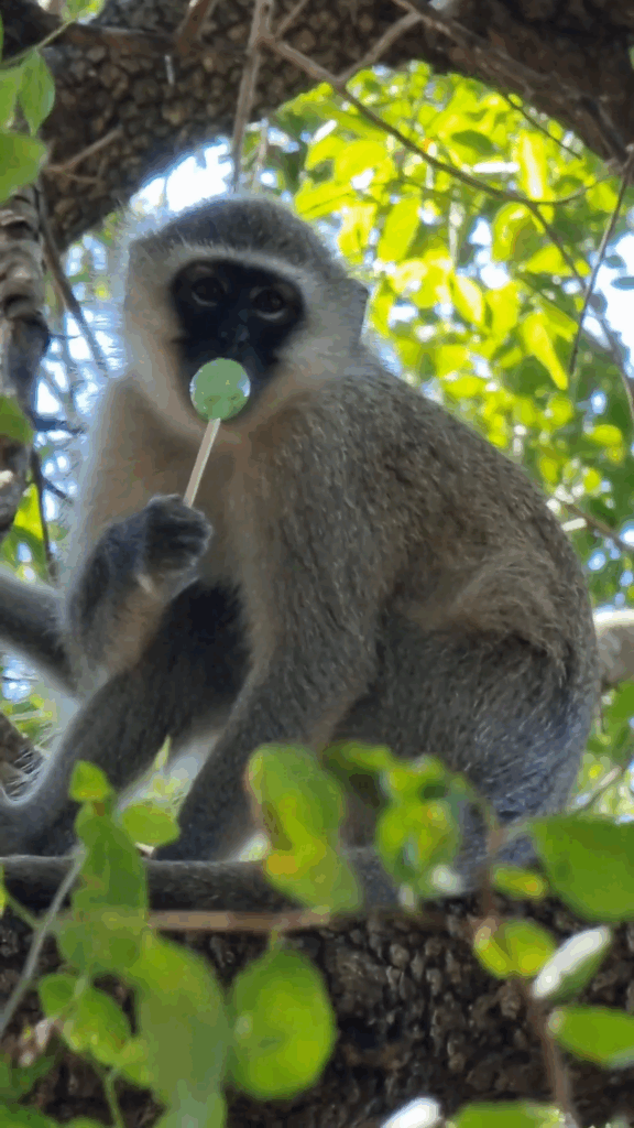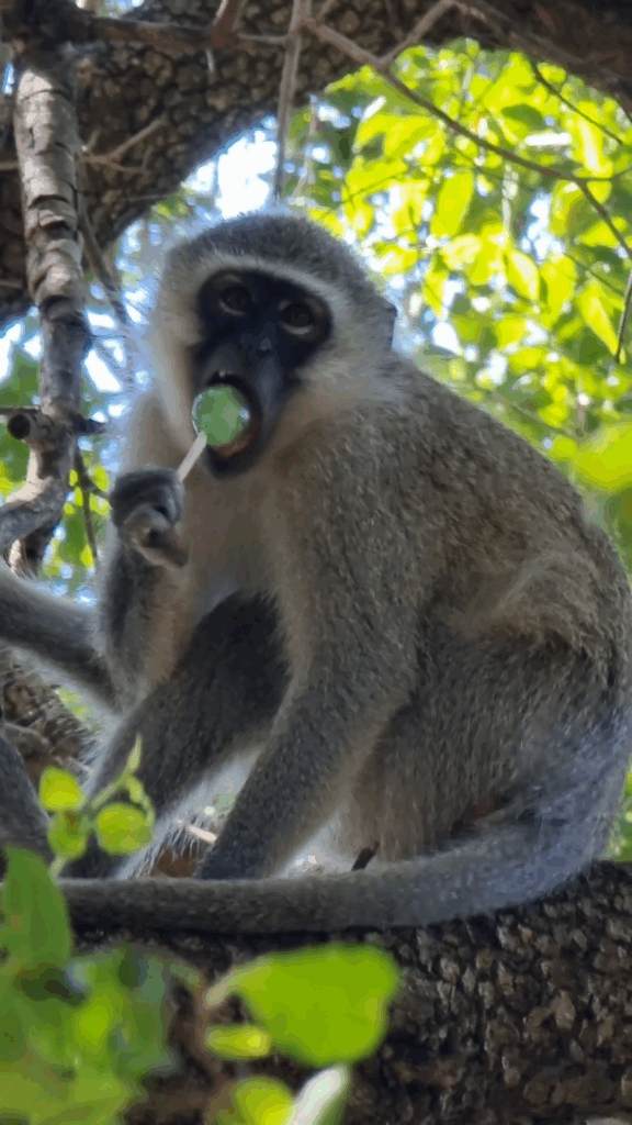 The monkey clearly felt no remorse at stealing from a child, and it was quite happy to show off evidence of the crime as it consumed it in the trees. It’s important not to feed the animals in the Kruger, and to keep food in a place where they can’t find or steal it.