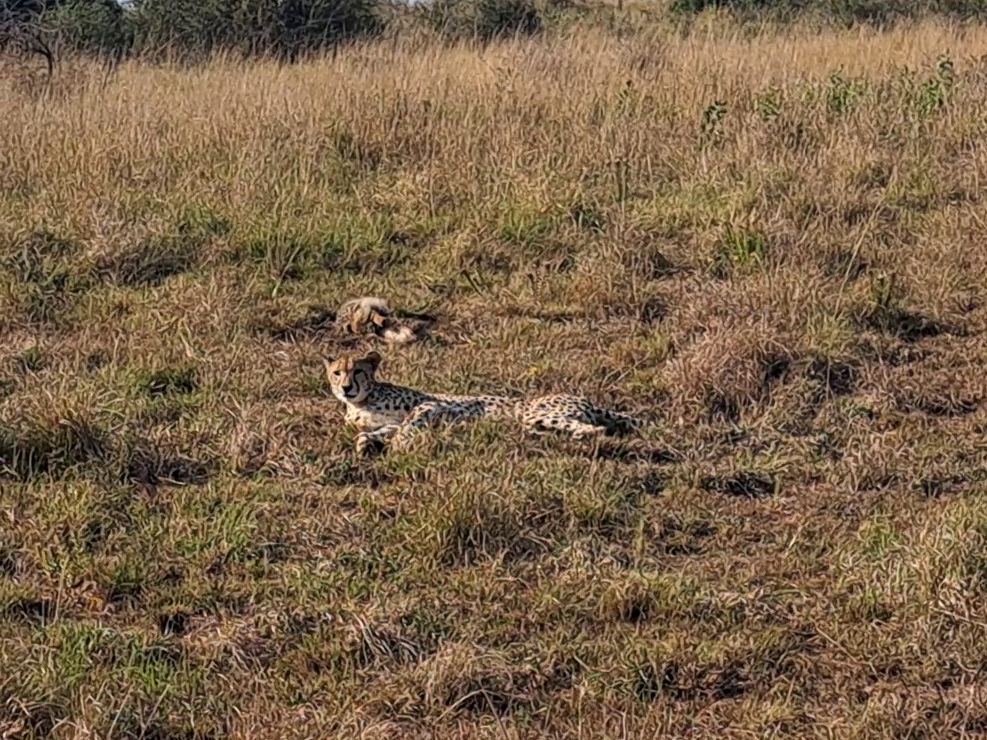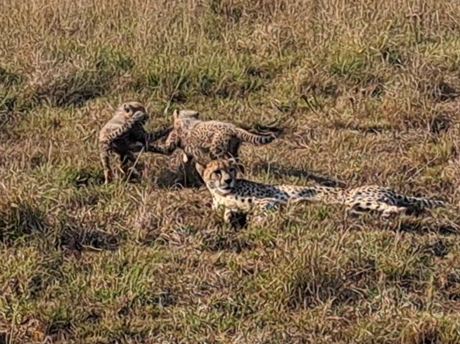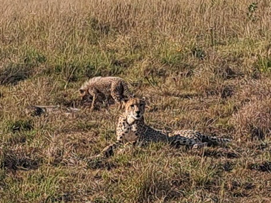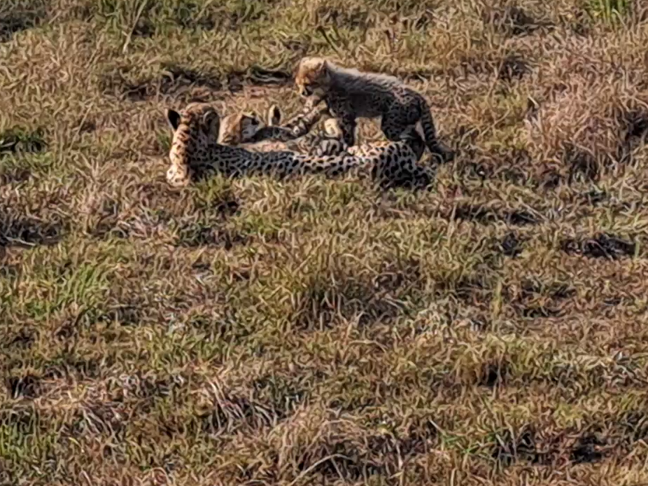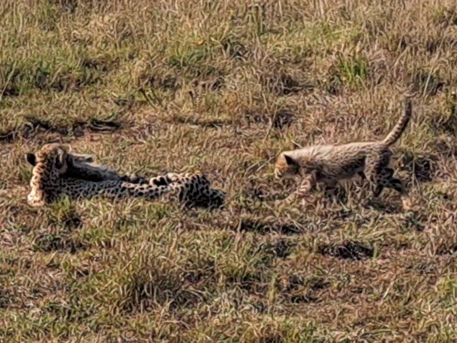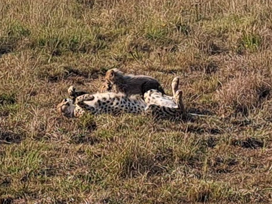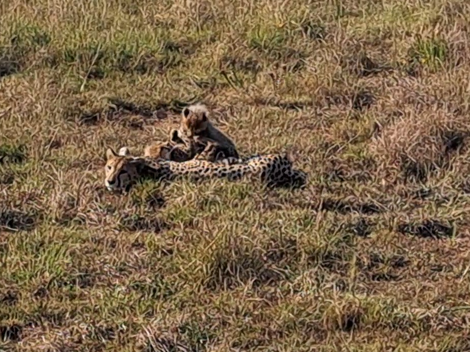 Our story begins with a special sight. A female cheetah lies on the grass, her slender body just barely hiding a playful cub behind her.