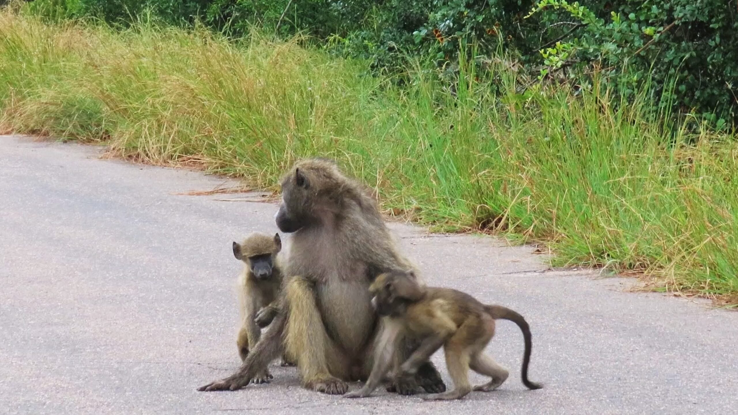 By the time the troop eventually moved off the road and the sighting came to a close, mom had been climbed on, prodded, lifted, and generally treated as communal property for the entire duration. She bore it all with a kind of dignified exhaustion that felt deeply relatable.