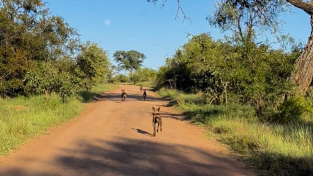 Ahead of the wild dogs, the group of impala burst across the road in desperate flight.