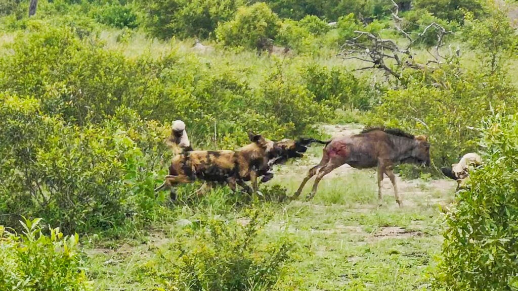Leslie and the rest of the group were able to see this lethal potential translated directly into terrible action when the pride of dogs happened to come across a very unlucky baby wildebeest.
