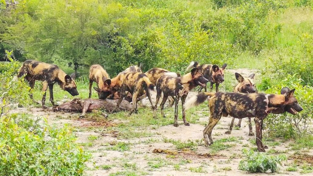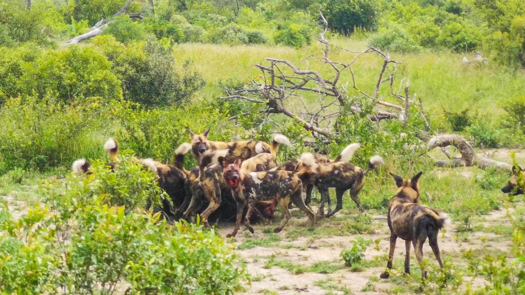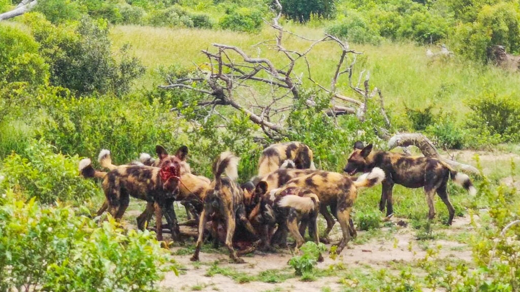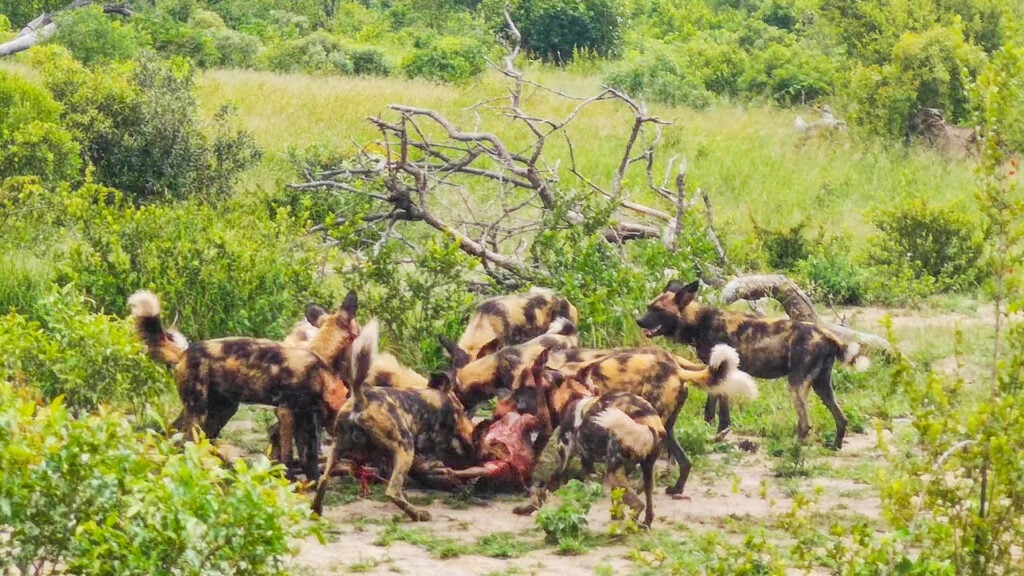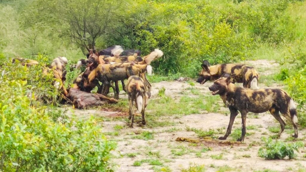 Despite the dangers they pose in numbers, wild dogs have learned to eat quickly as larger predators like lions and hyenas might be in the area, and these are capable of forcing the dogs away from their meal.
