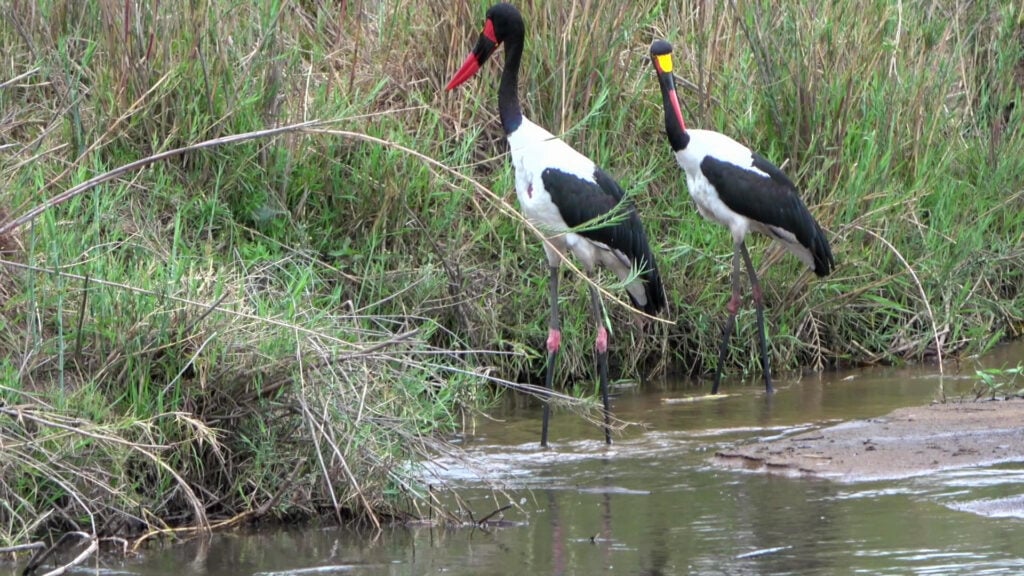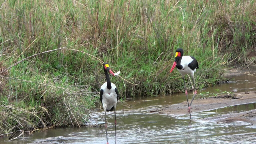 The pair of saddle billed storks could be seen wading through the shallow waters alongside some long grass which skirted the river. They were hoping to make a catch, being highly skilled at catching fish.