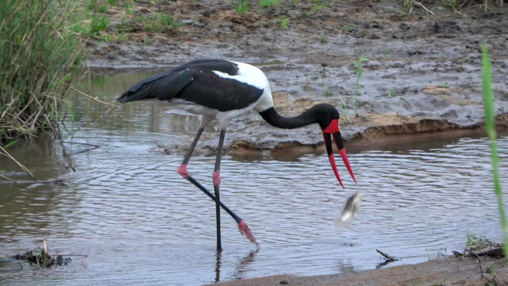Saddle billed stork captures fish