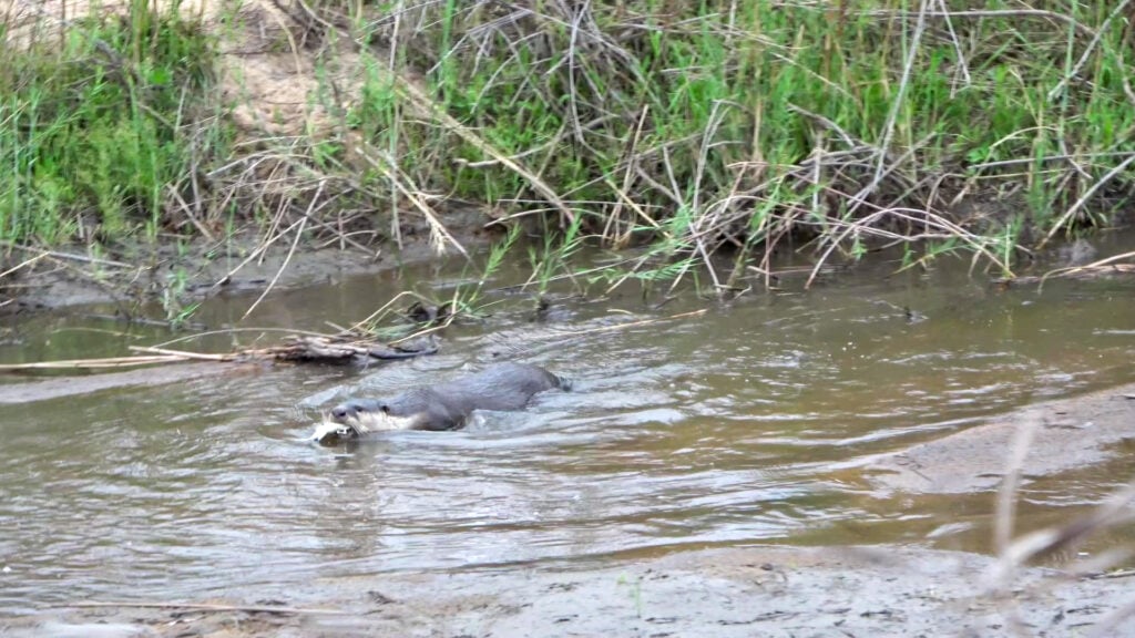 The otter continued to hold the lion’s share of everyone’s attention. He even moved a little out of the river onto the muddy banks, before resuming his pleasure-filled swim.