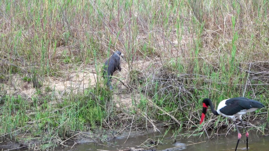 However, in spite of there being little competition between the species, this otter spied a fish the saddle billed stork had killed and moved swiftly towards it.