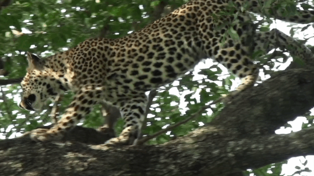 Suddenly, the leopard decides to retreat and is seen descending from the tree canopy. But what has caused this sudden change of heart?