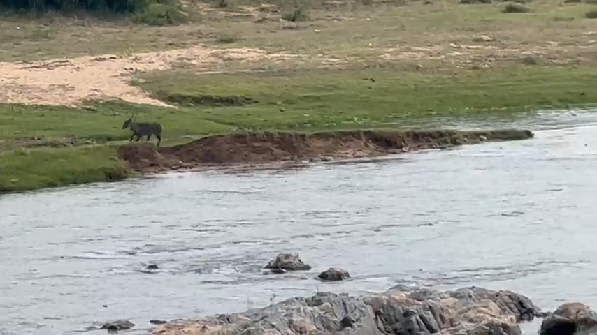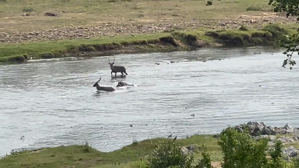 When threatened, waterbuck typically bound away using these telltale high, springing leaps. This escape plan definitely worked for these waterbuck, and they made it safely to the shore.