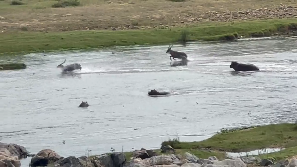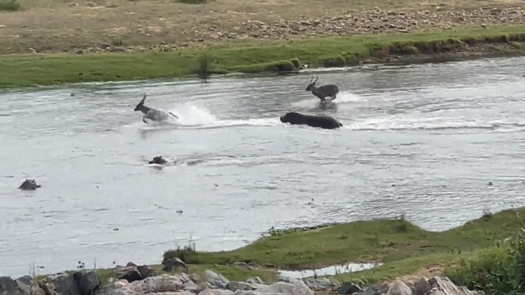 The hippo continued to chase after the waterbuck, and they were so startled that they appeared to be jumping across the water’s surface.