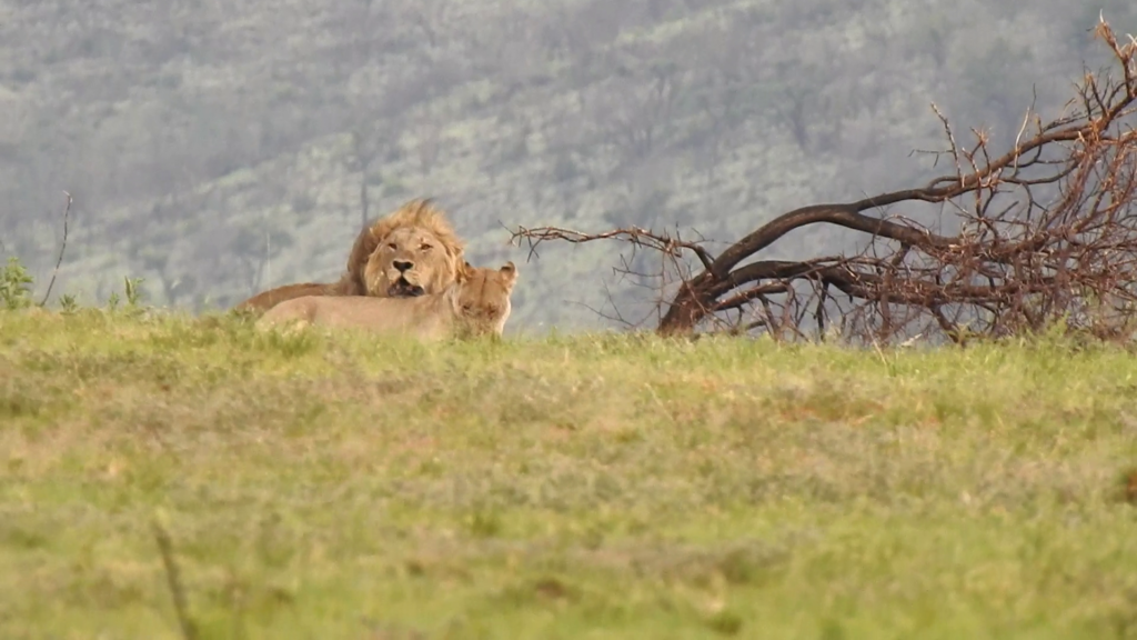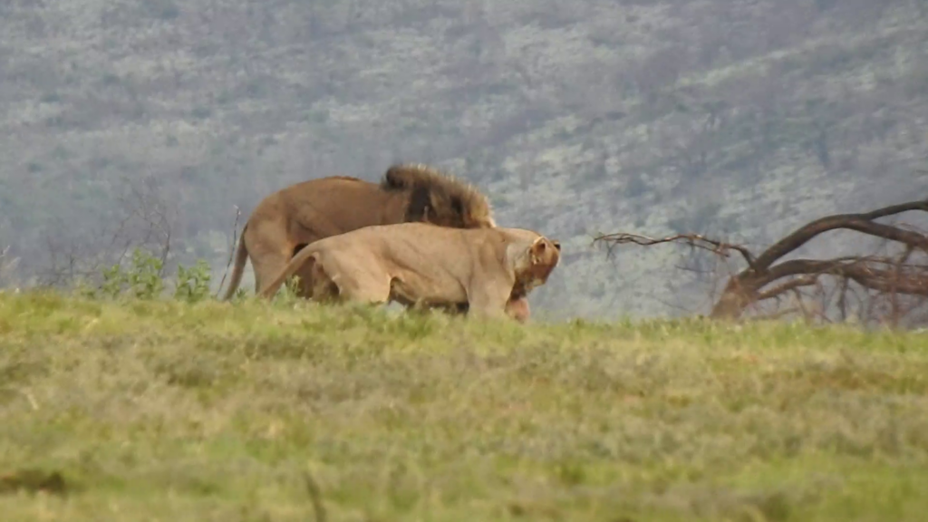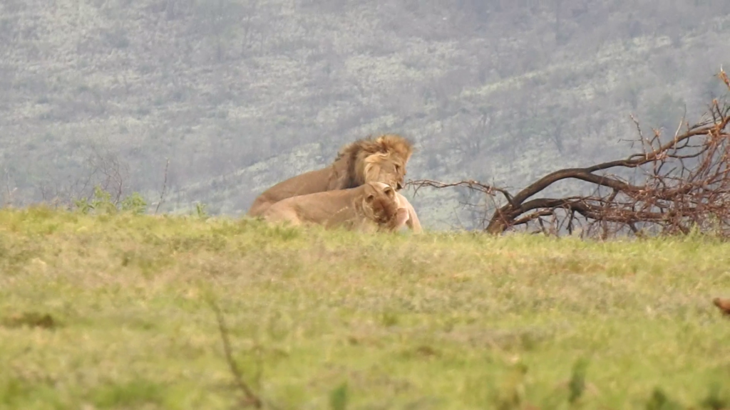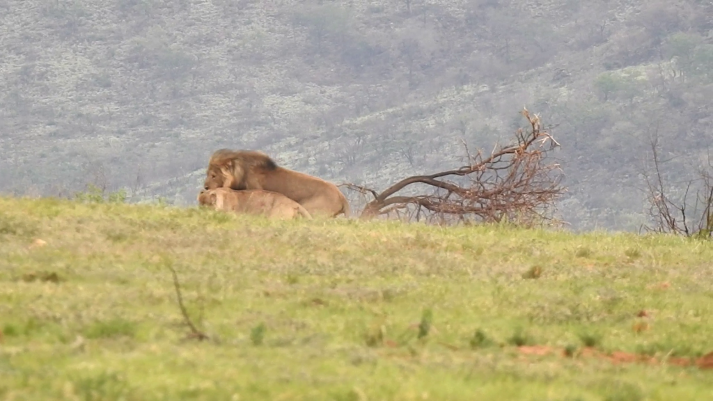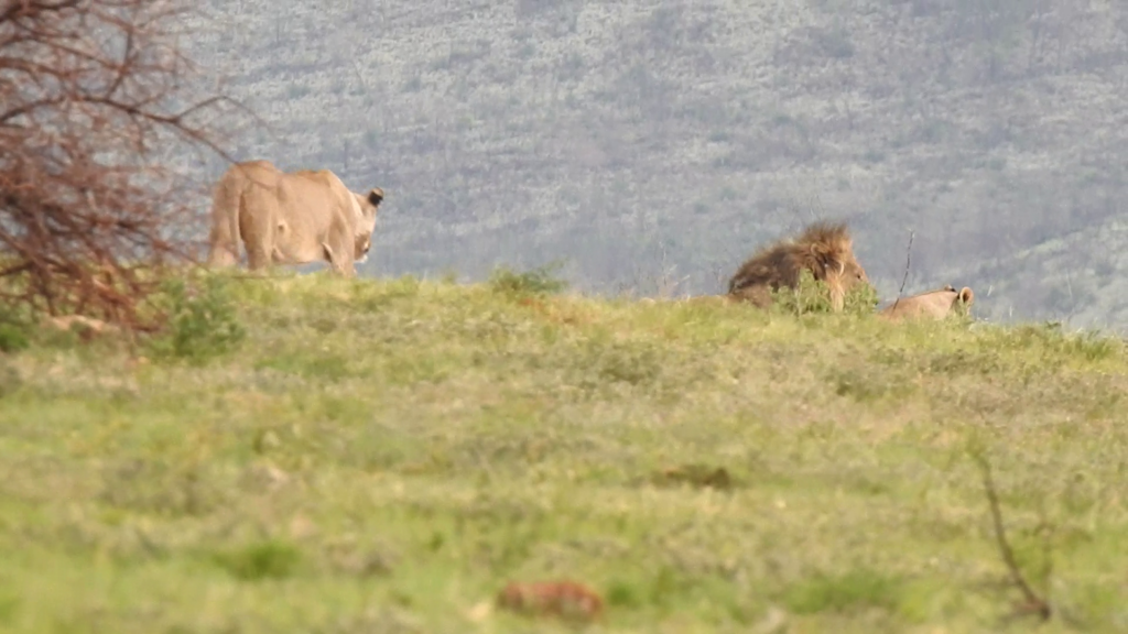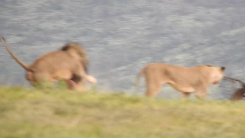 In Claudia’s video, which was filmed at a great distance, the camera settles on a male and female lion. Situated on a ridgeline, we realise that they are fighting over something.