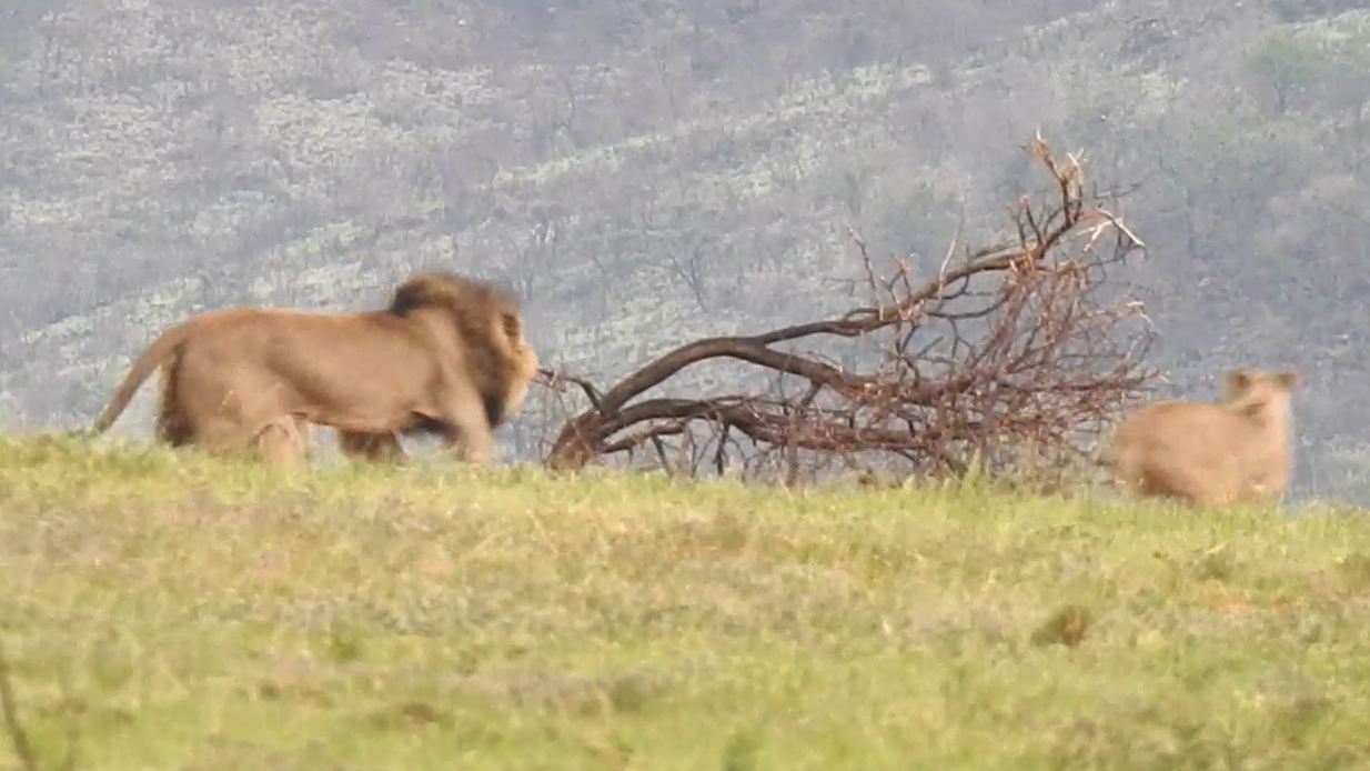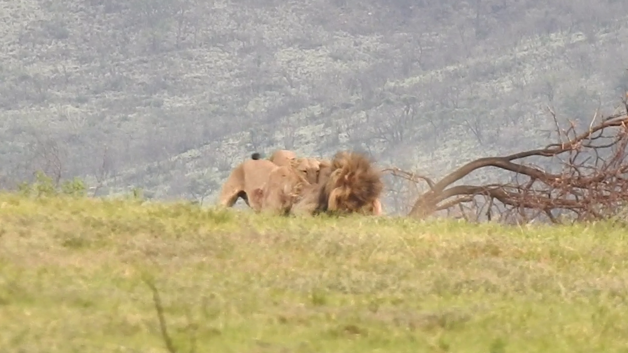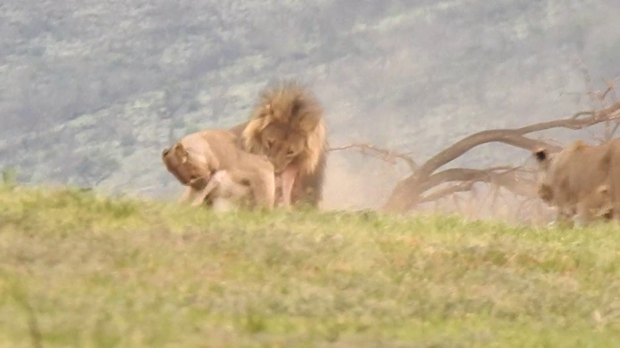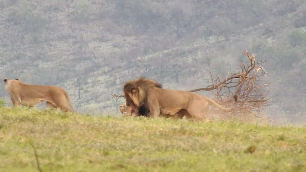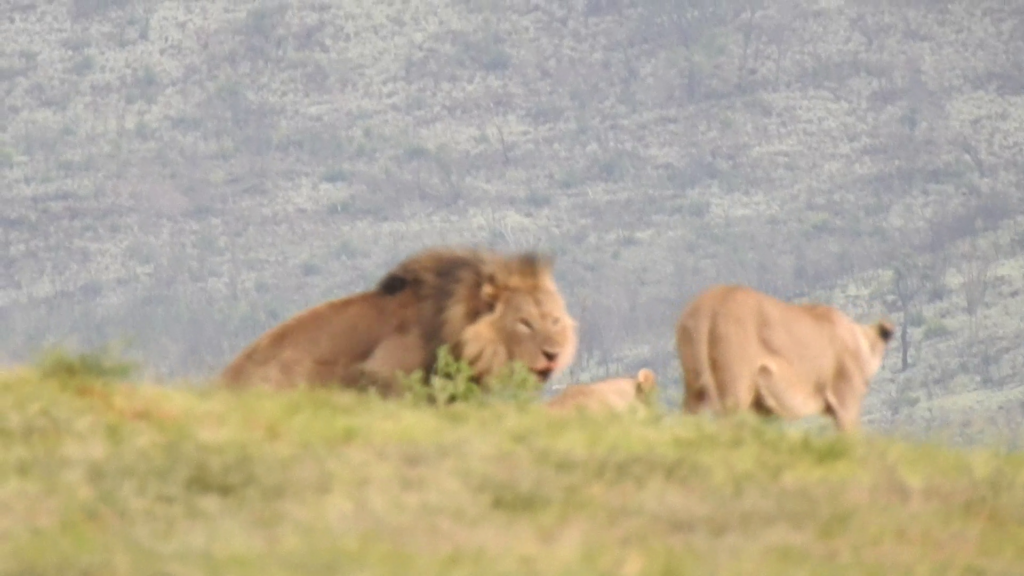 In Claudia’s video, which was filmed at a great distance, the camera settles on a male and female lion. Situated on a ridgeline, we realise that they are fighting over something.