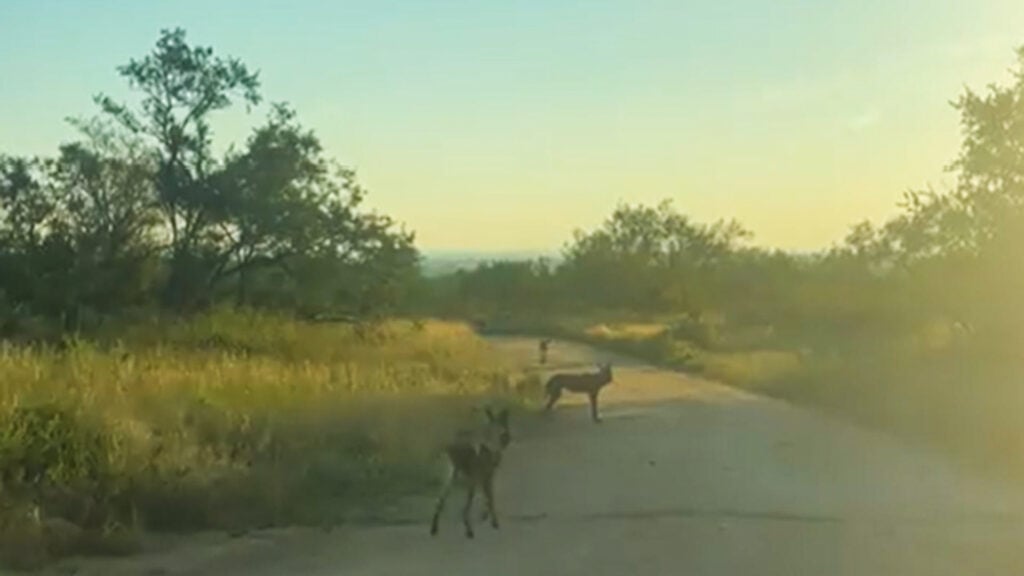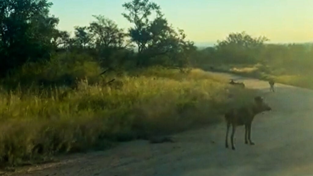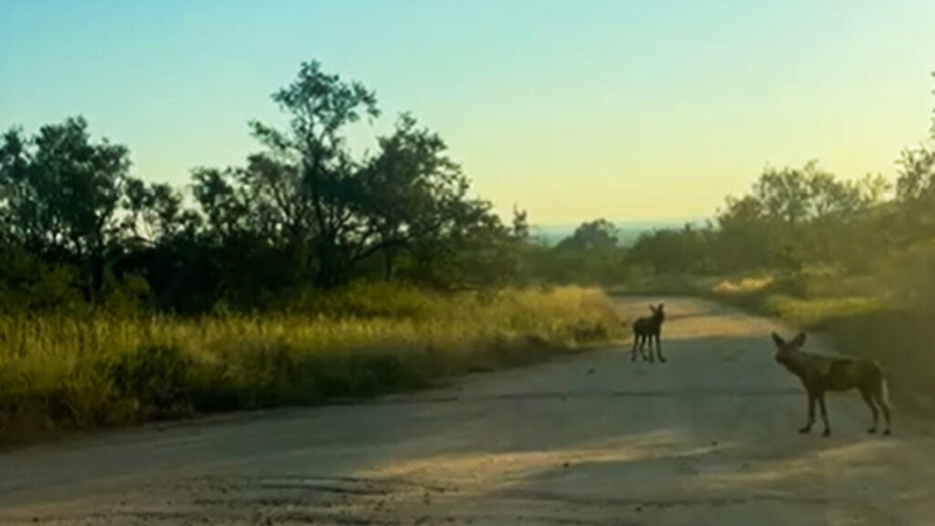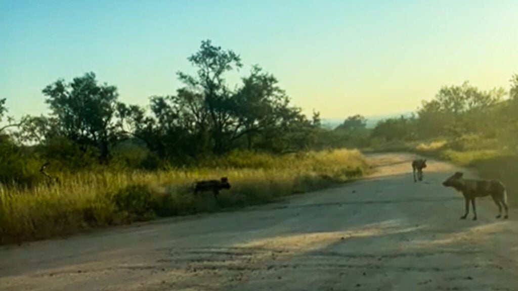 At the beginning of David’s footage, the wild dogs were calmly milling about in the middle of the road, padding along on their four paws as they kept a close eye on their surroundings.