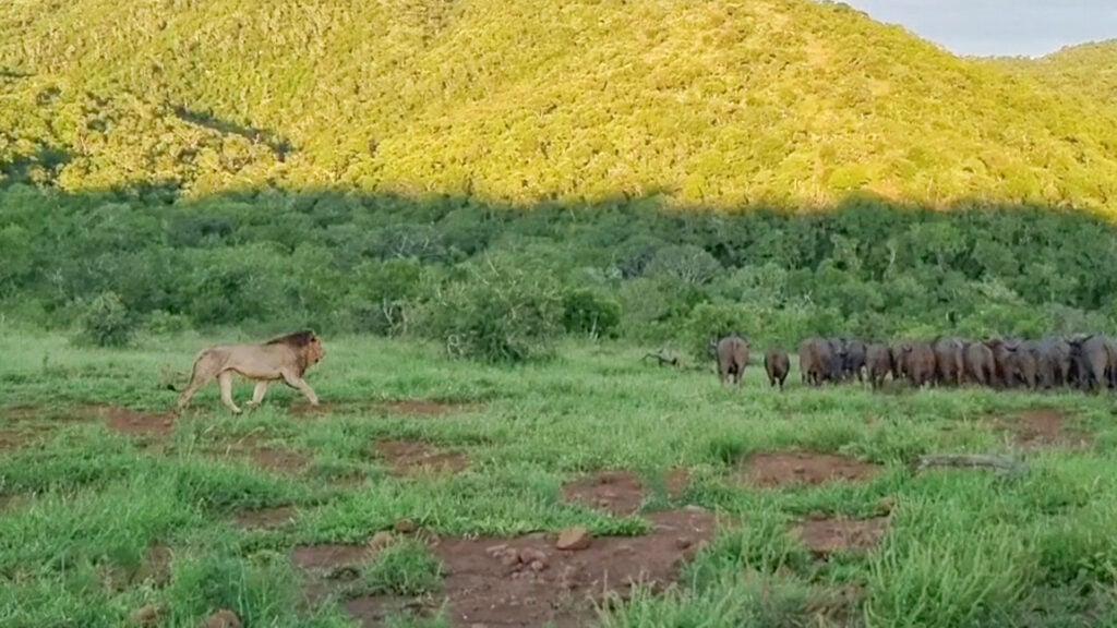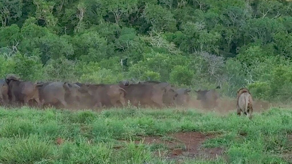 In approaching the buffalo, this lion put itself at risk. If lions get too close, buffalo may charge as a coordinated force. A single well-placed gore or trampling can severely injure or kill a lion.