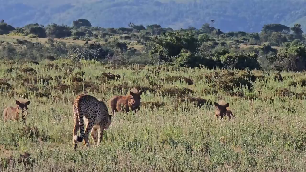 Warthogs are within a cheetah’s potential prey range, however, as this sighting shows, they are actually far from easy targets. Adult warthogs can weigh between 50 and 150kg. Though they may look awkward while kneeling to graze, they are surprisingly fast and agile when alarmed!