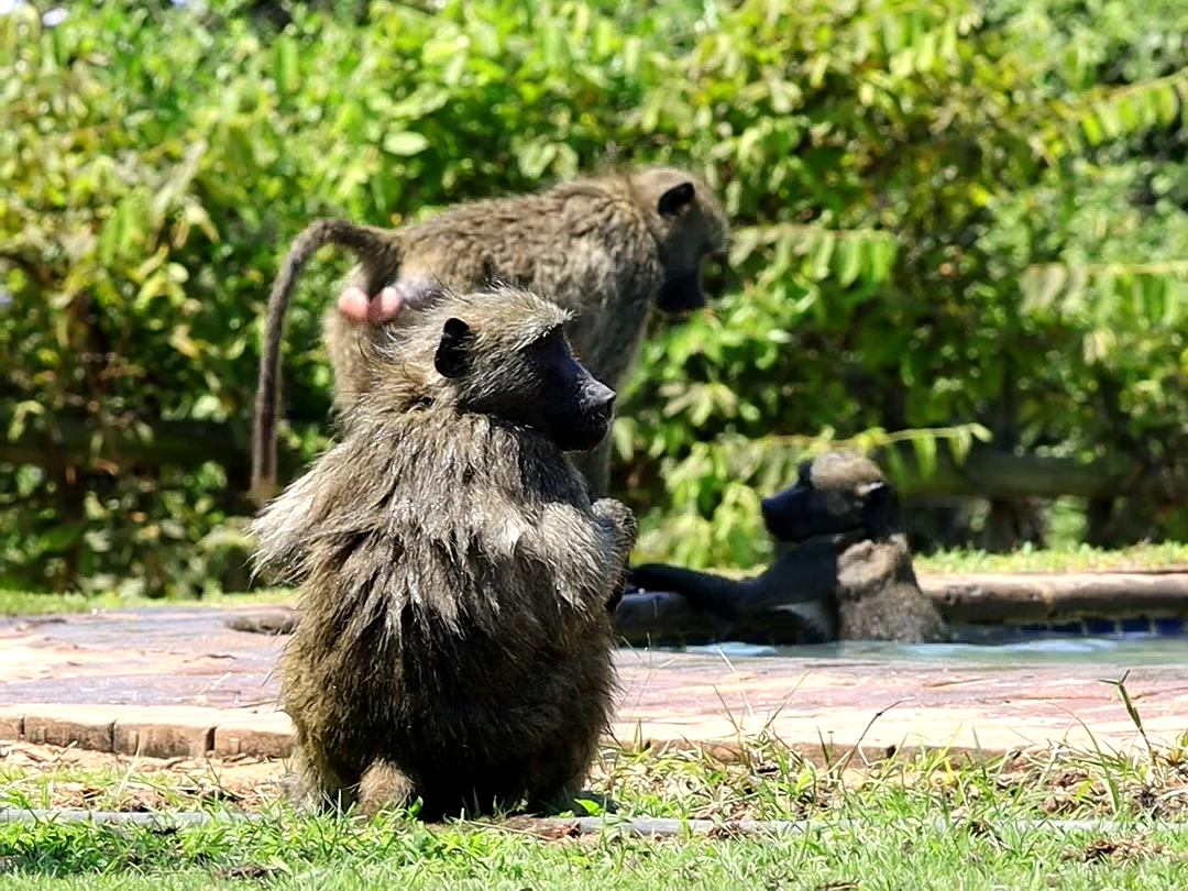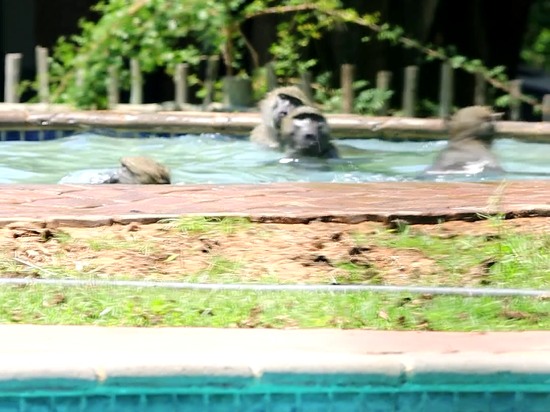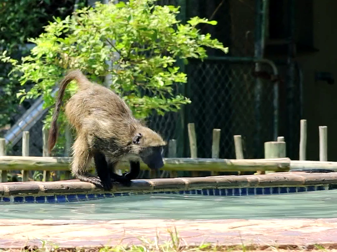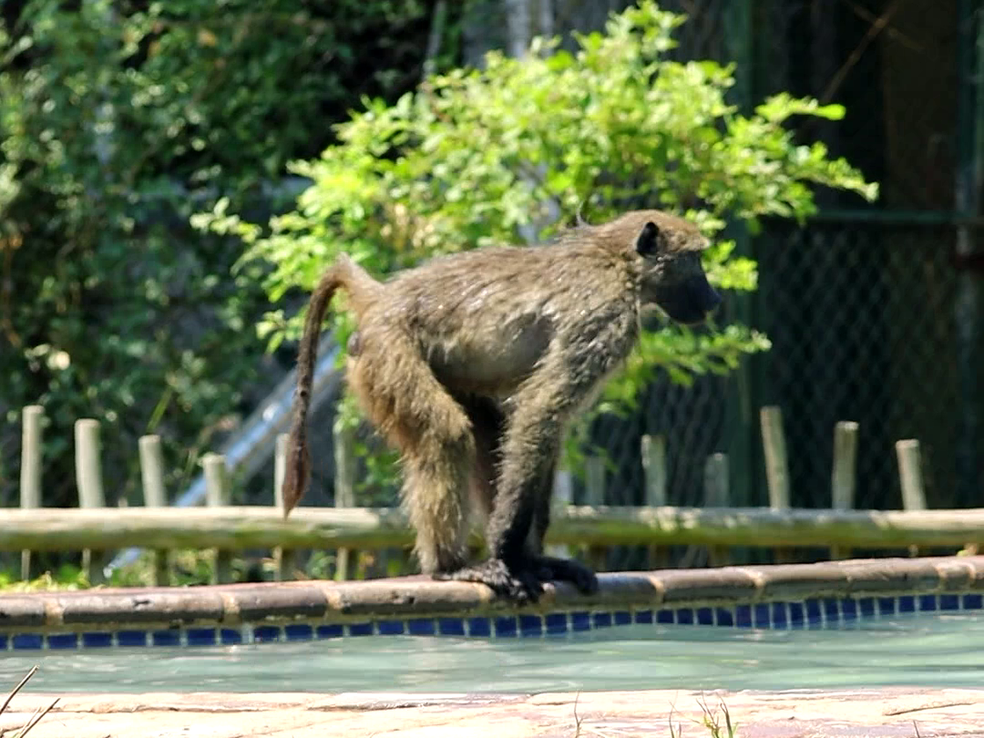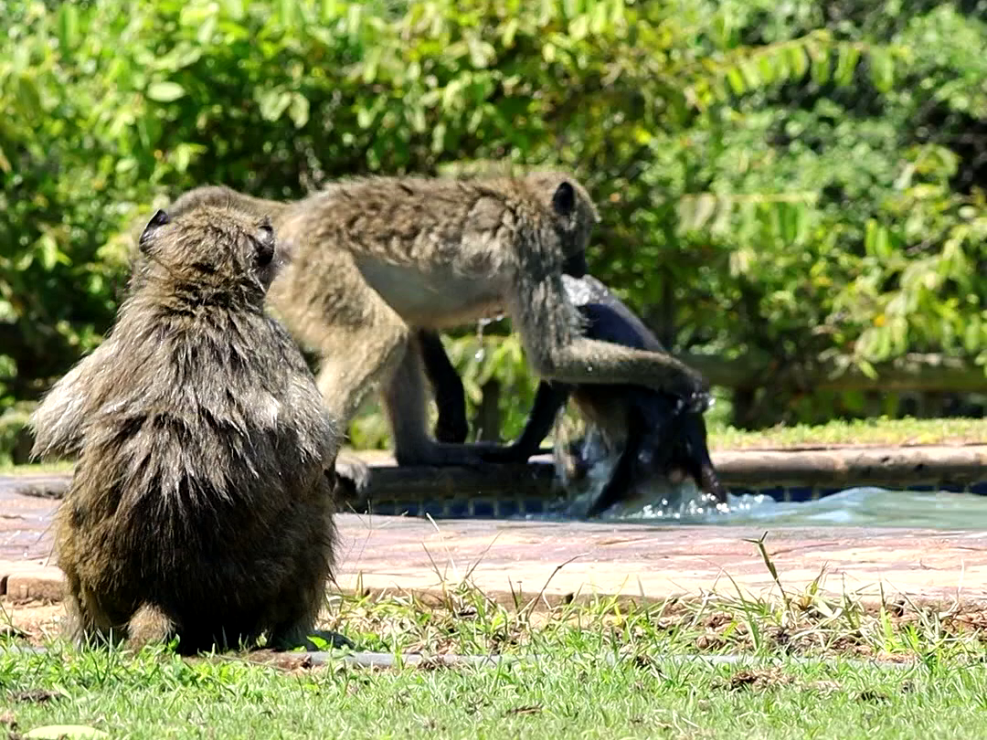 Whatever the case, in a matter of seconds, the scene transforms from poolside peace to a full-blown pool party. Soon, no fewer than four baboons are cavorting as if it were the most natural thing for them to do.