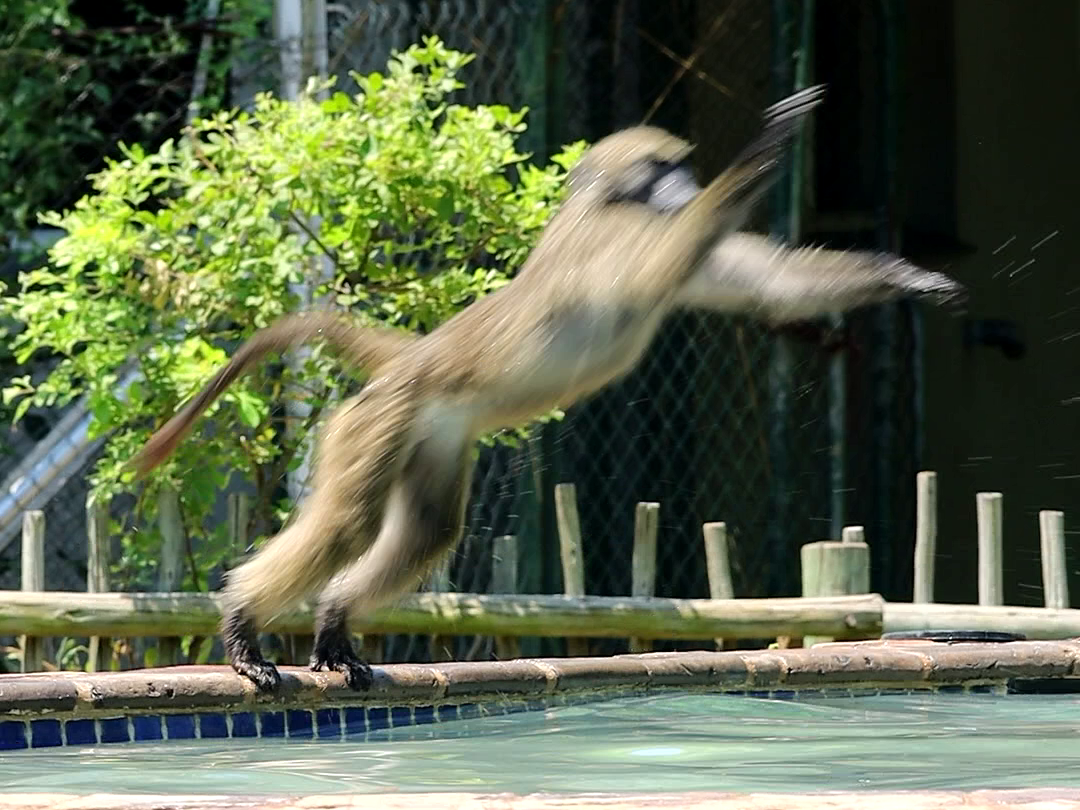 Instead of drinking, the baboon tenses its body before launching itself into the air. By its trajectory, we can tell that it knows exactly what it’s getting itself into.
