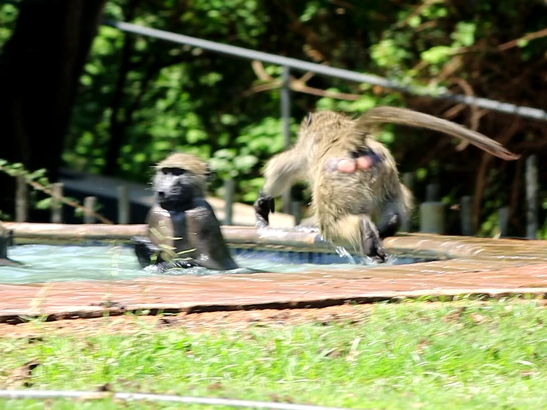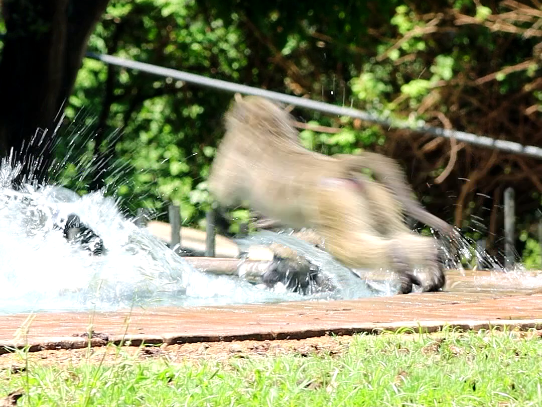 For several minutes, the baboons play, chasing each other around and taking great delight in making big splashes when they jump into the pool.