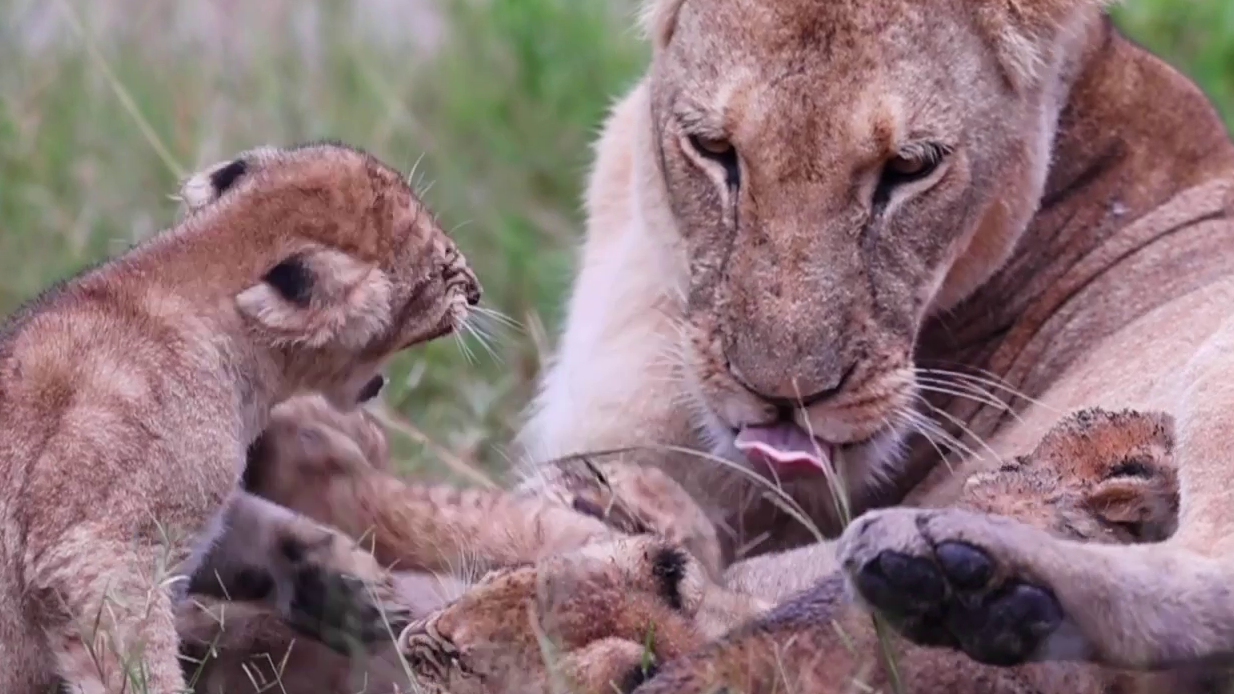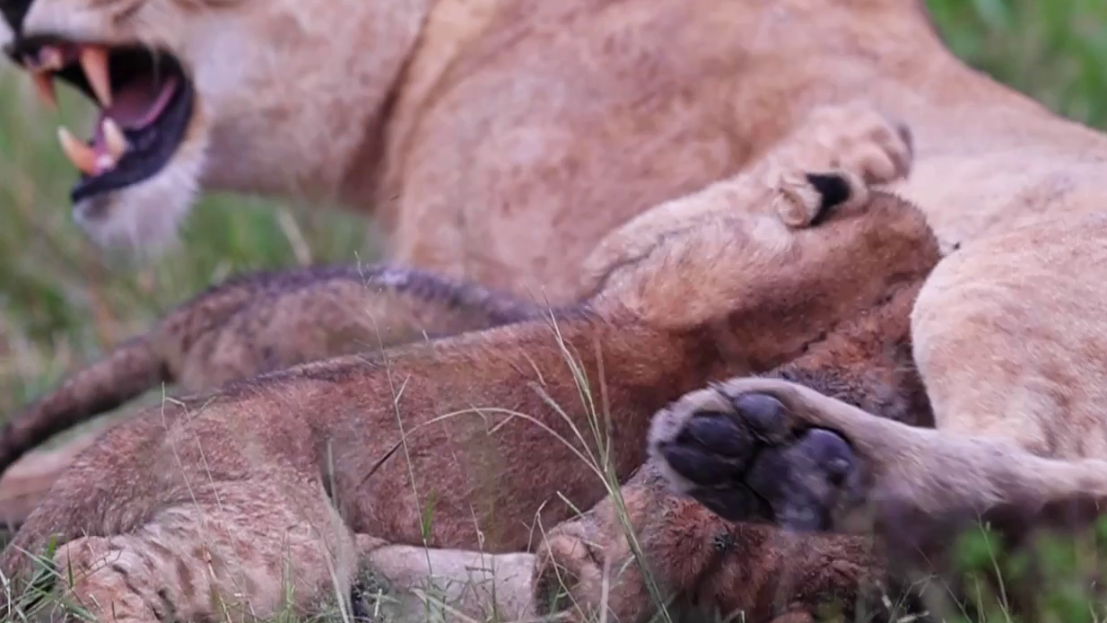 In the first clip, a lion cub has been squeezed out of its feeding position. As Mum grooms and its siblings continue feeding, it throws a tantrum.