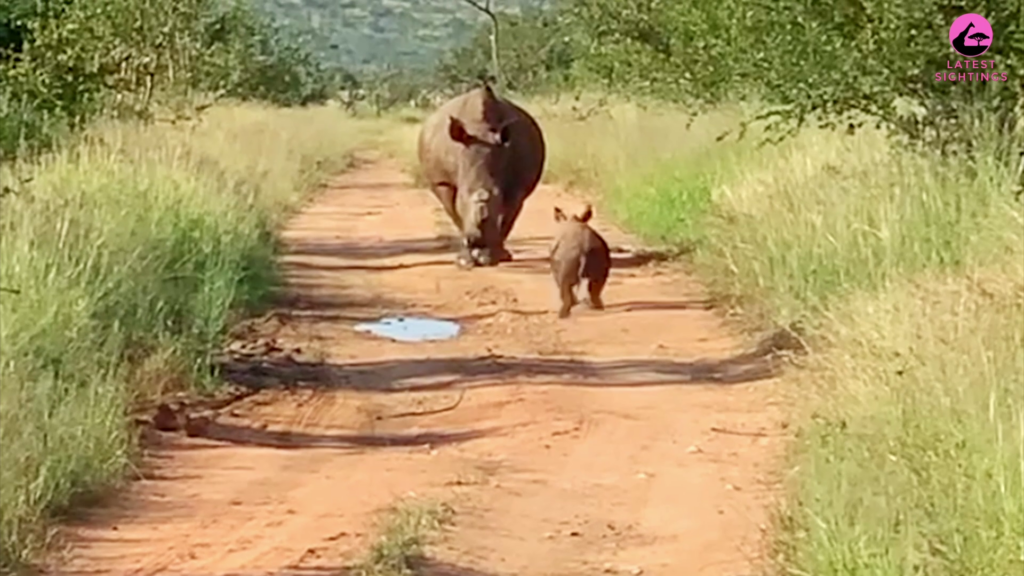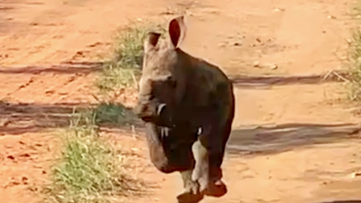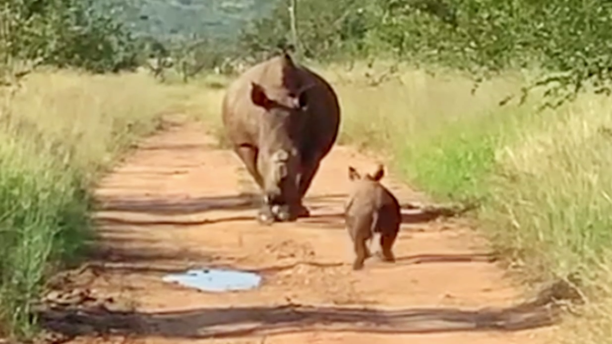 Next, we see a young white rhino charging up the road towards the camera. Meanwhile, in the background, its huge mother trundles slowly closer.