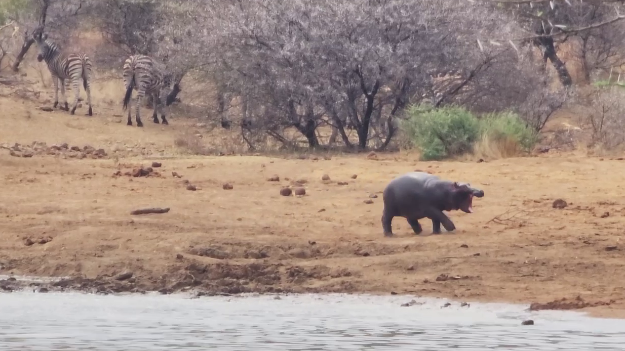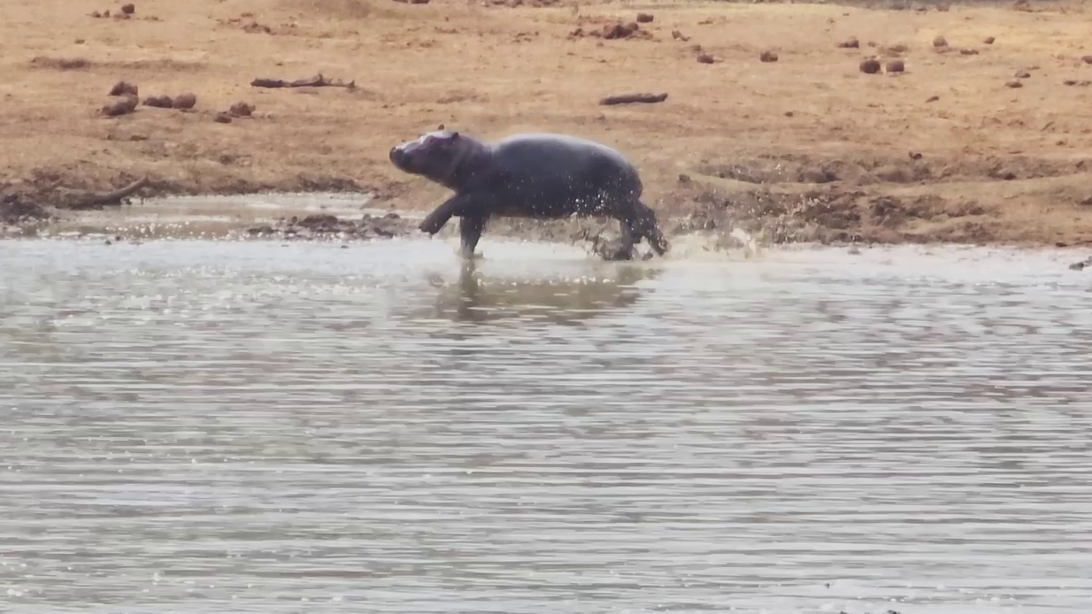 In the next clip, a baby hippo is seen running around on the bank of a waterhole. In the background, a herd of zebras looks on anxiously. They’re eager to drink but wary of the hyper-hippo.