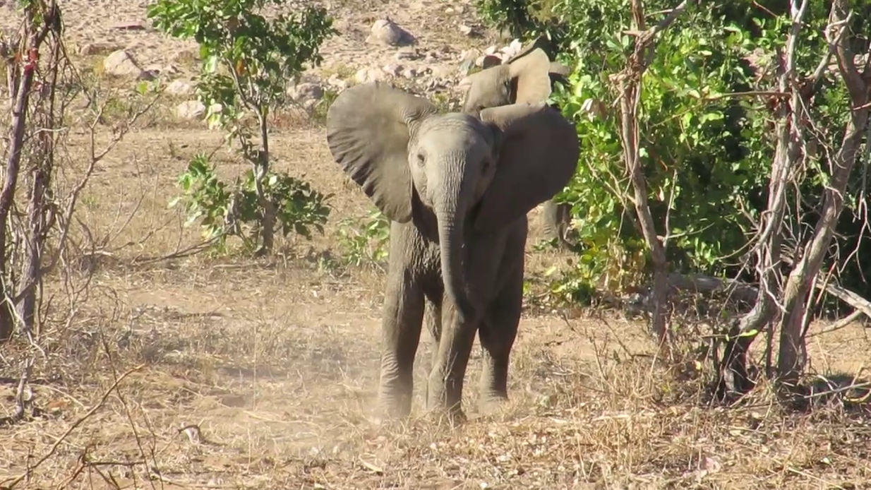 Our next example is a young elephant bull whose out to prove a point. With his ears flared and head held high, he charges towards the camera, letting out a cute little trumpet.