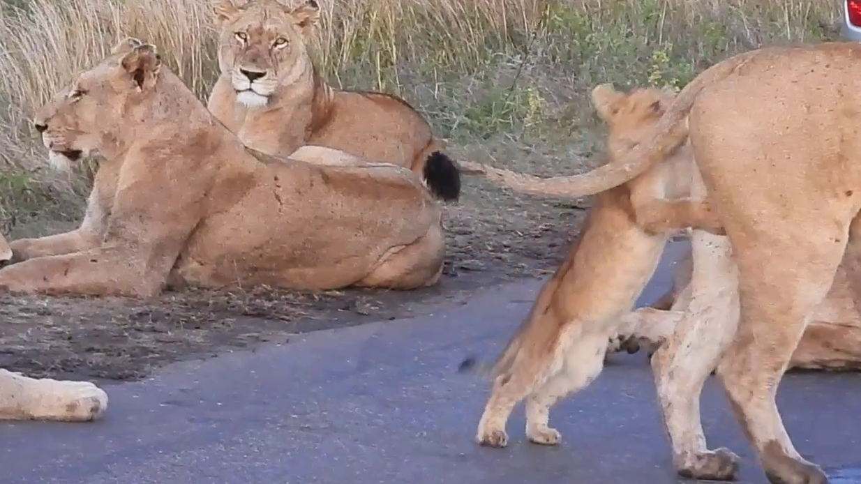 In the final clip, an adorable lion cub tests the patience of its pride. To begin with, it looks like the picture of innocence.
