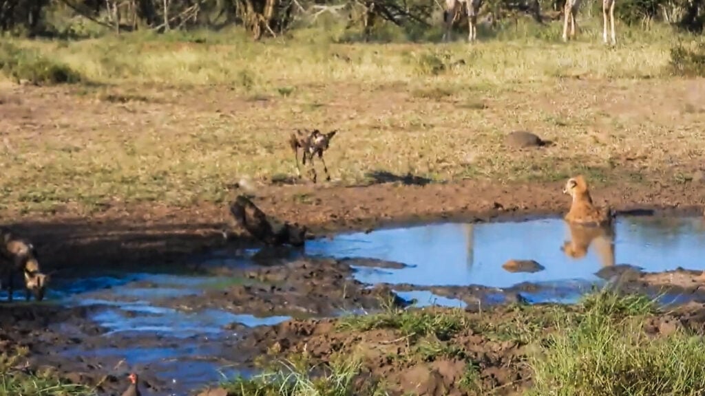 It was a particularly tranquil scene that was about to have a sizable dash of tension mixed in as a pack of wild dogs spied the water, and hurried over to get their own drink.