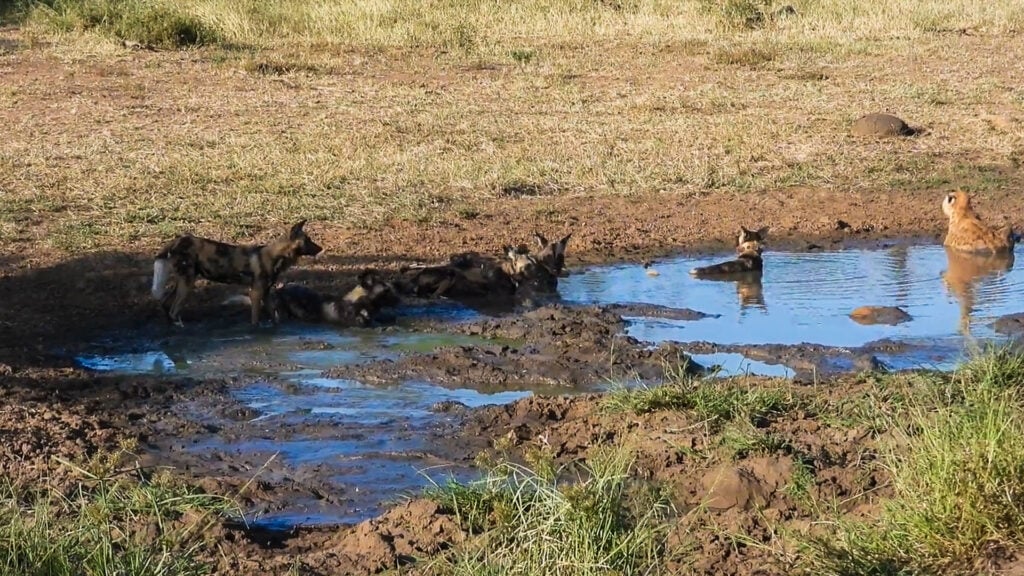 From their safe distance they could watch the events unfold, while still being able to turn and flee if things went poorly. As the bathing hyena watched the wild dogs moving quickly towards it, it seemed likely that things would go bad quickly.