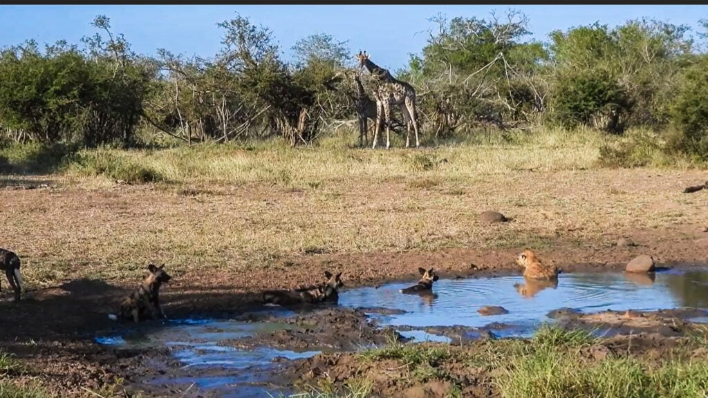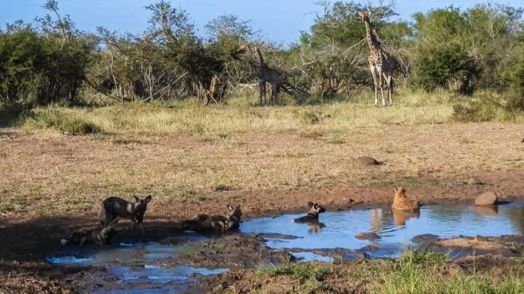 Although it was the wild dogs and hyenas that caused tension over the water supply, they weren’t the only animals present at the occasion. As the wild dogs bounded over to the hyena’s water, two giraffe’s looked on from afar.