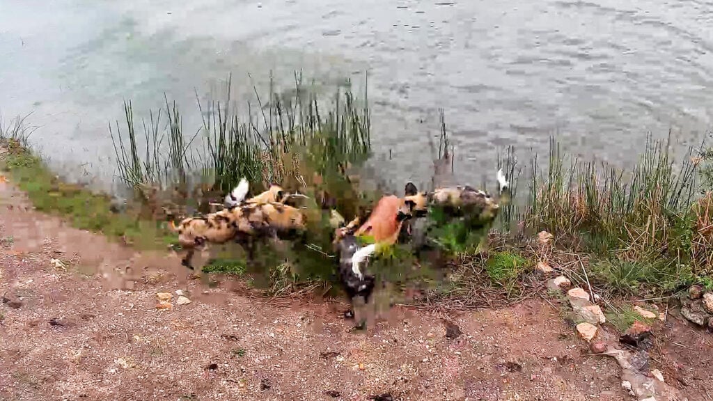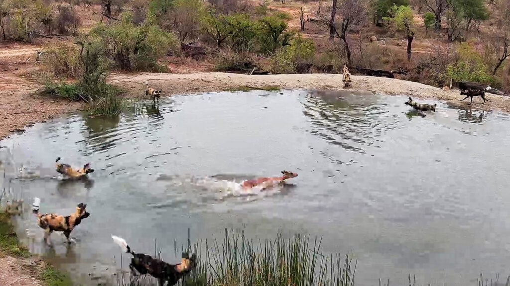From the moment the impala entered the water, it took less than two minutes for the wild dogs to complete their hunt. After following the impala around the edge, one of the canines dived into the water and quickly ended the matter.