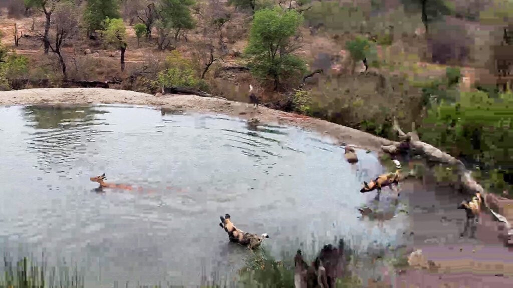 By complete coincidence, the dogs managed to trap their prey at a water hole, and then it was just a matter of time, waiting for the best moment to decisively strike and secure a meal.