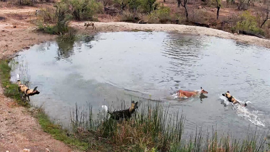 While this decision might have bought a few more extra minutes of life for the impala, it had also guaranteed that the wild dogs would be able to capture it. The waterhole was small enough that the wild dogs could run around the circumference quicker than the impala could swim.