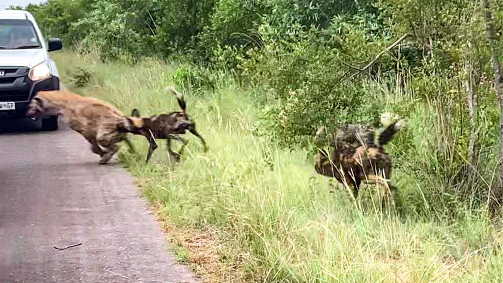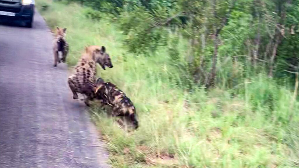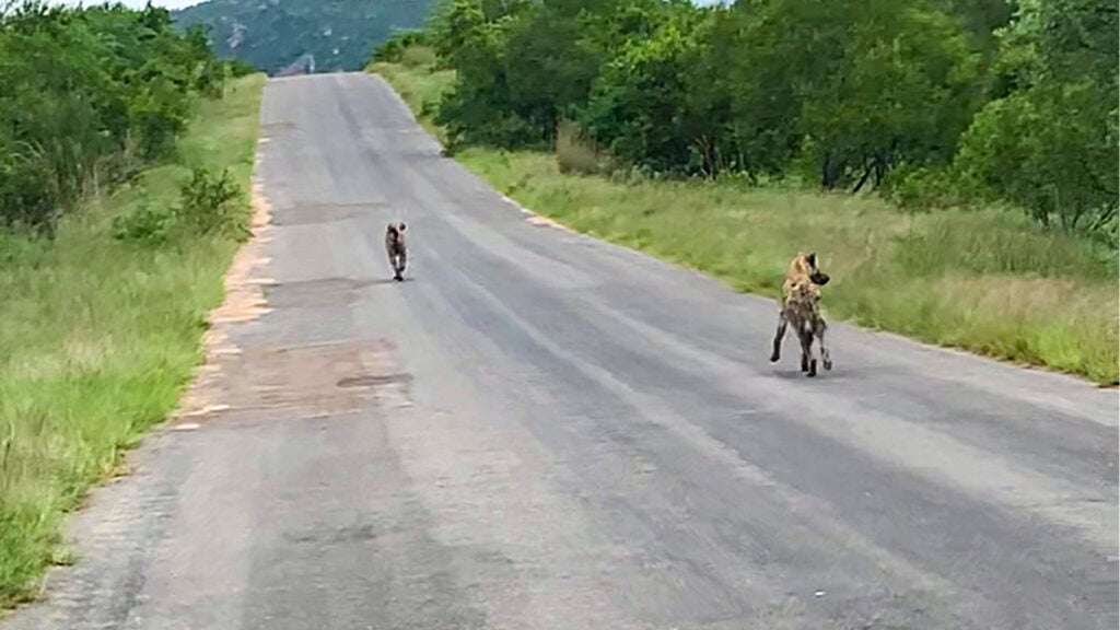 If the hyena clan had instigated the conflict, then they’d quickly lost the upper hand as a wild dog attacked and chased one immediately into the road, right next to Daniel’s vehicle.