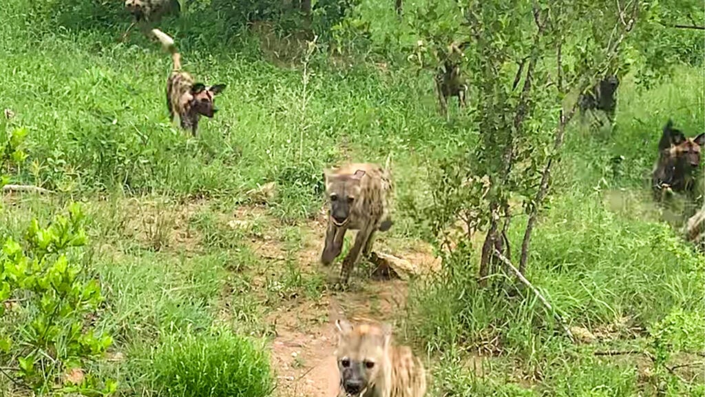 While the opening strike was a single wild dog chasing one lone hyena into the road, groups of hyenas and wild dogs were waiting in the wings to provide support to one another when the battle truly began.
