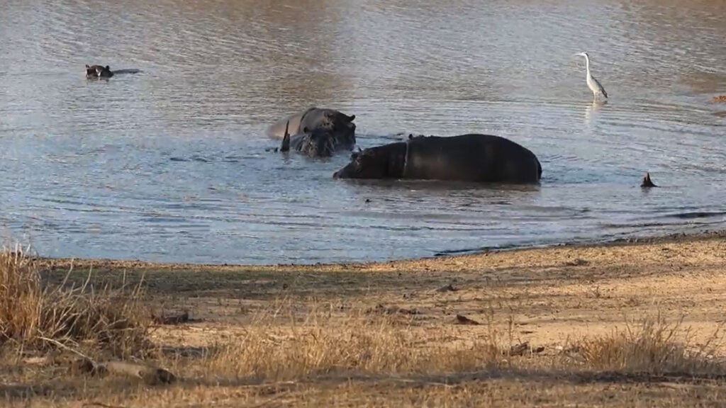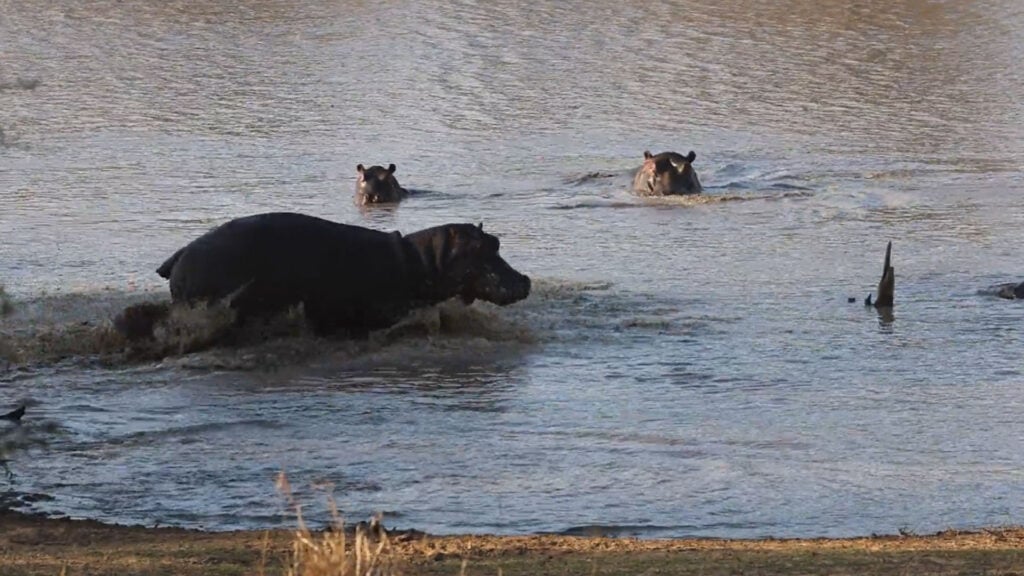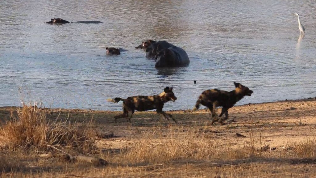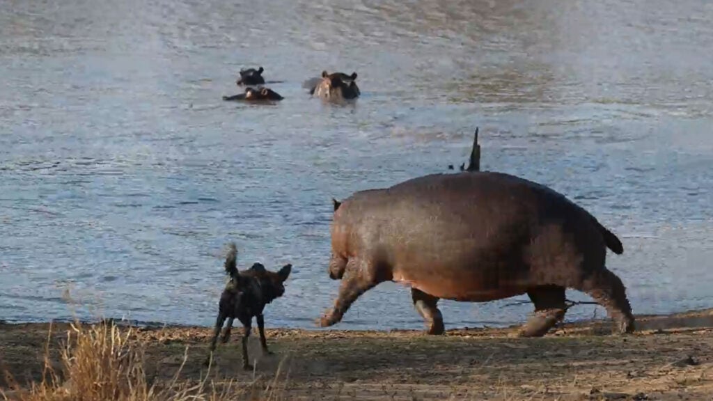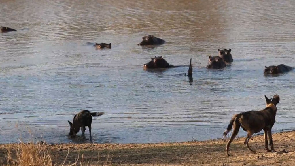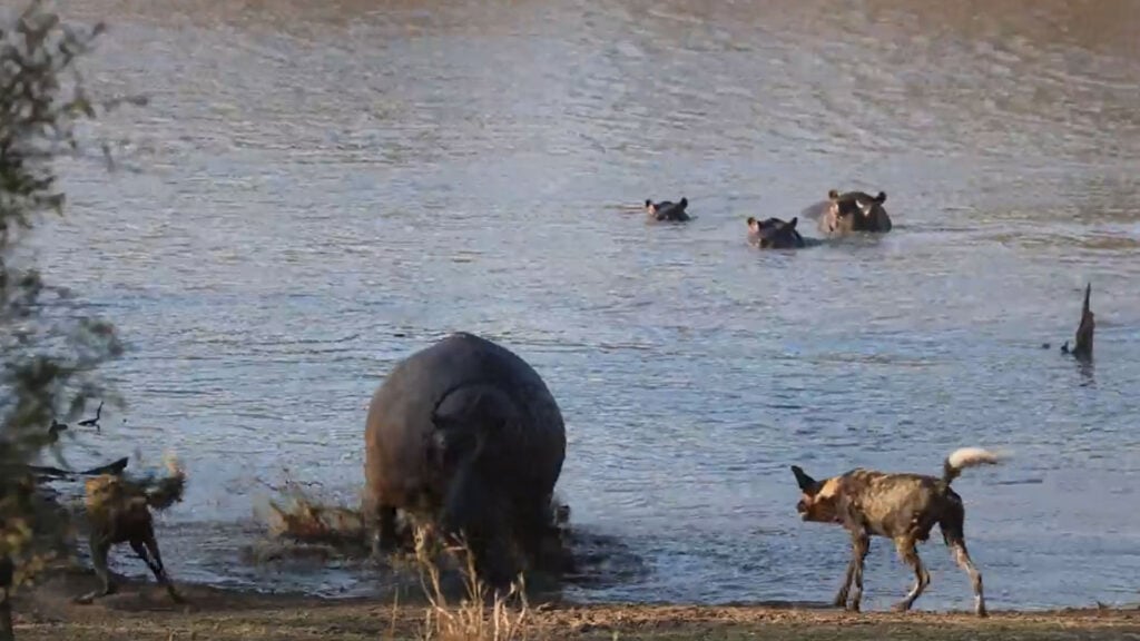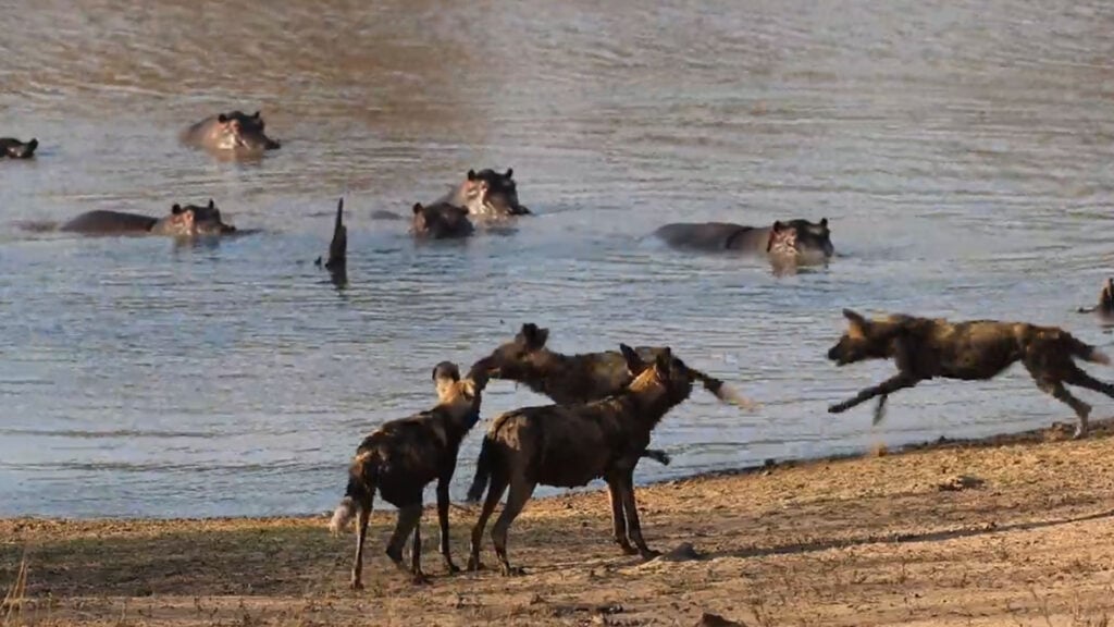 For most animals, the sight of a charging hippo would be enough to trigger an instant retreat. But for the dogs, although certainly caught off guard, they seemed to have other ideas in store.