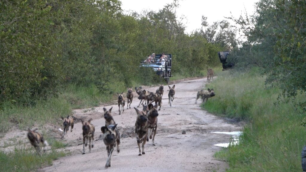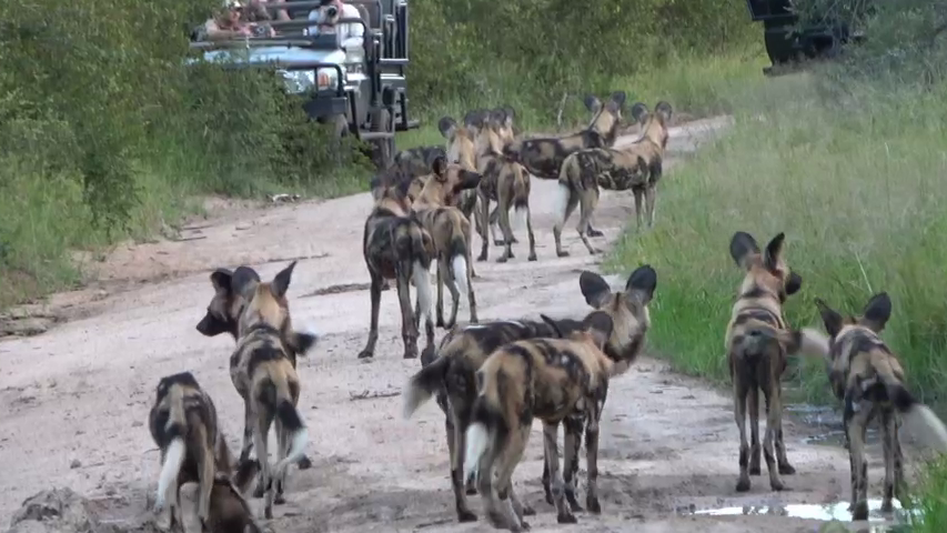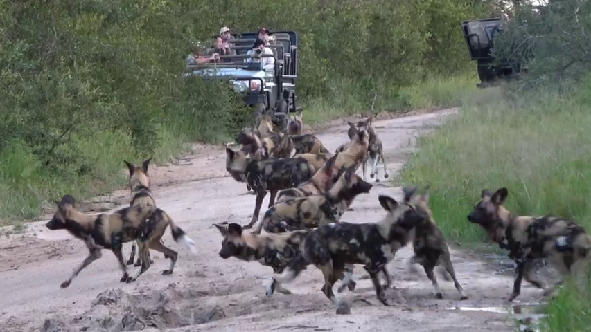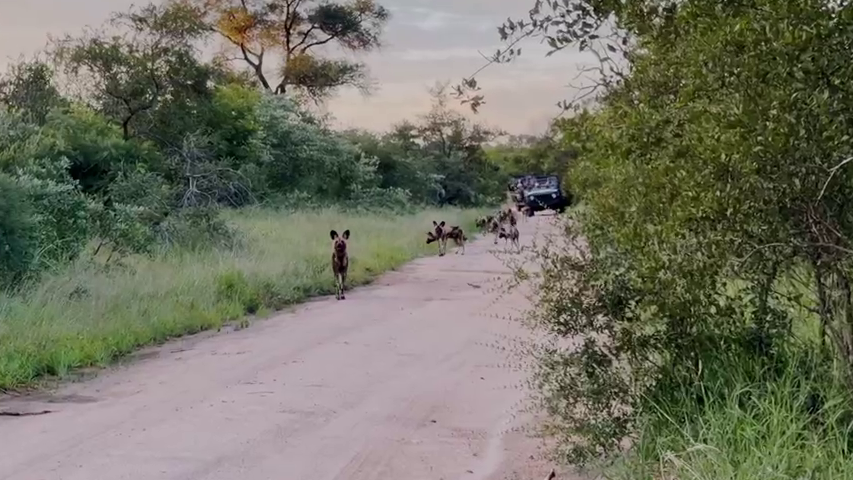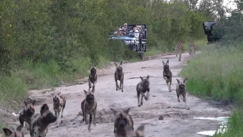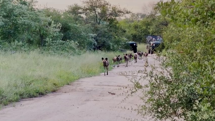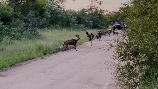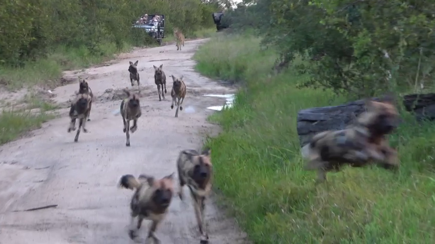 Subsequently, the camera pans away from the lions. Then, we see a pack of African wild dogs trotting up the road to where the lions lie hidden in the long grass.