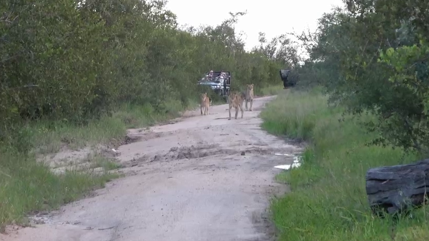 Seconds later, all three lions come running around the bend in the road. Their intention is clear, they’ve decided to go for the dogs.