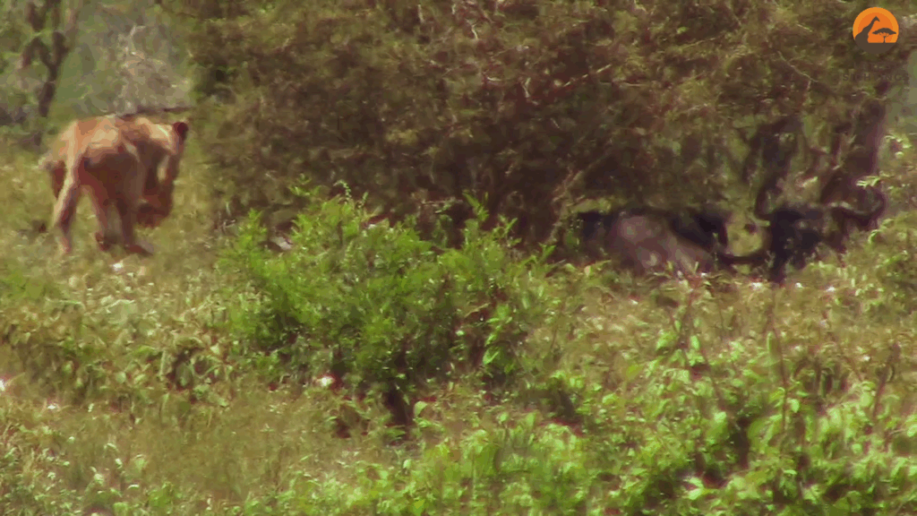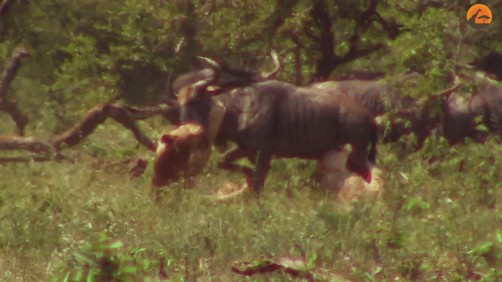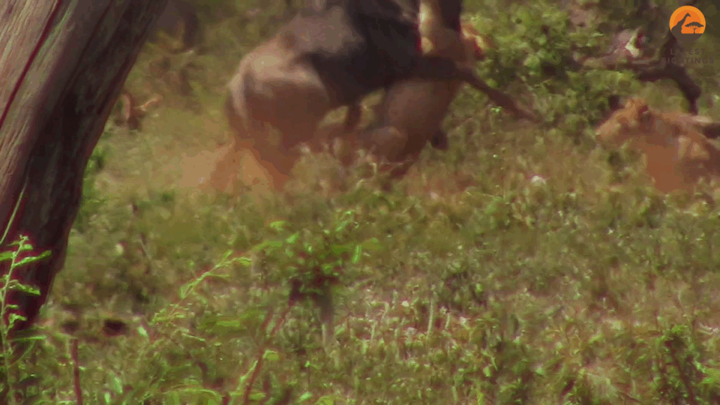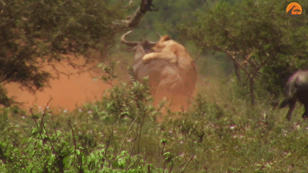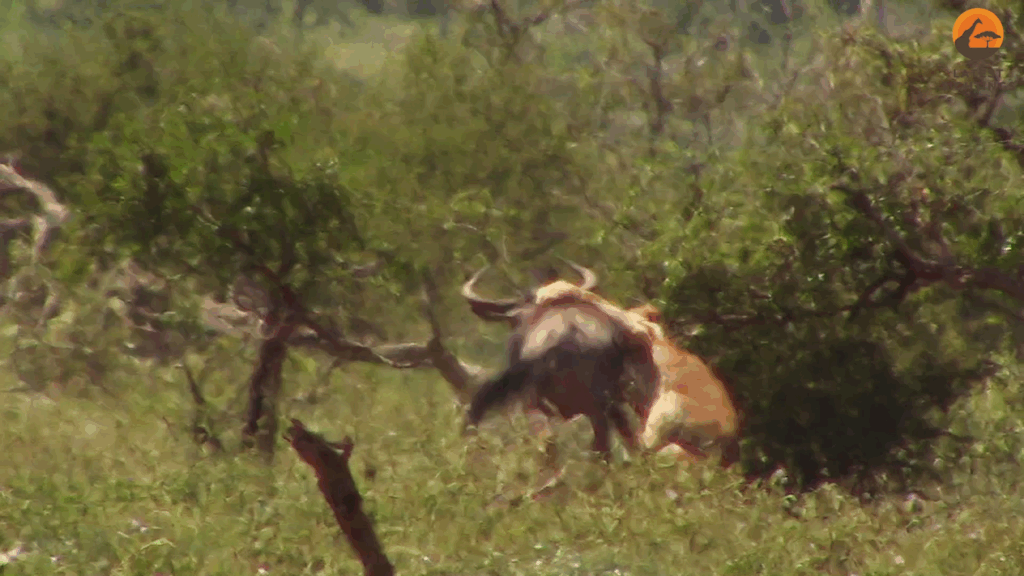 Still full of fight, the wildebeest is not about to make this easy for the lion. Bucking like a bronco, it tries to shake the lion off. At one point, it even tries to scrape it off against a nearby shrub.