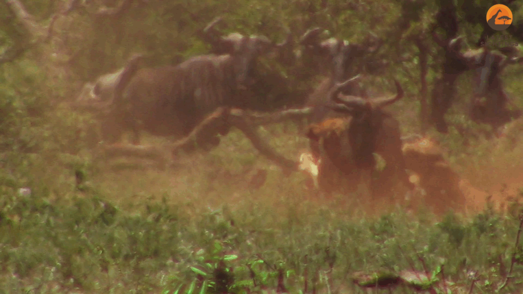 Despite enjoying the element of surprise, the lioness doesn’t manage to get the wildebeest by the throat. As the wildebeest turns, she has to cling to its back to prevent its escape.
