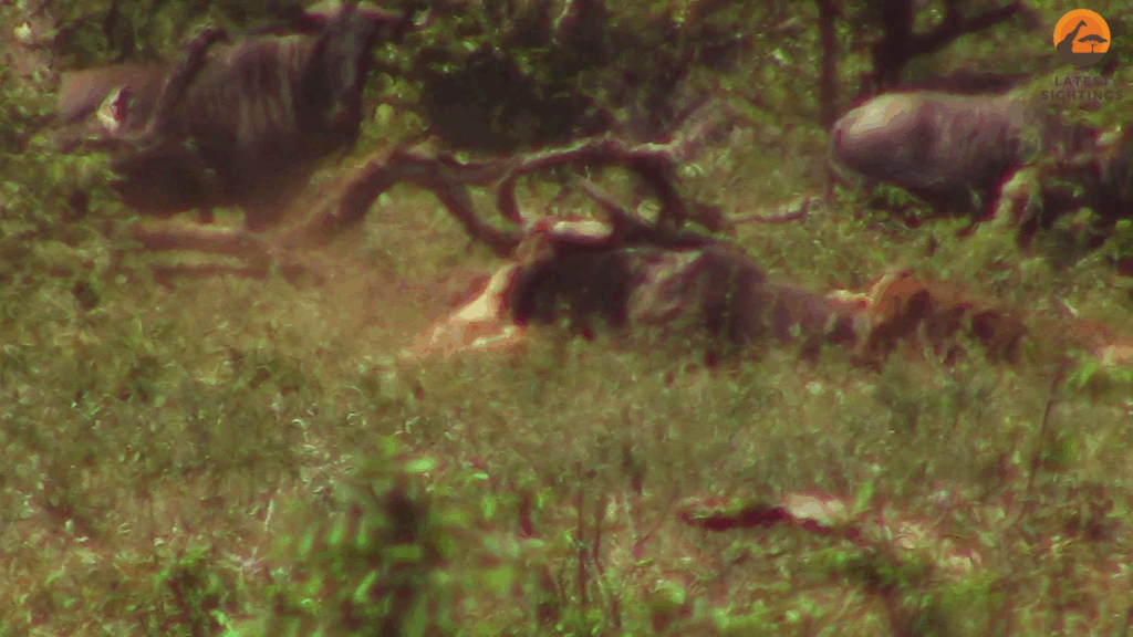 A short while later, having determined she is within range, she picks up the pace and starts sprinting toward a wildebeest lying underneath a bush.