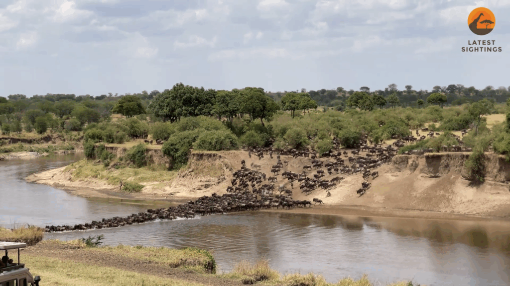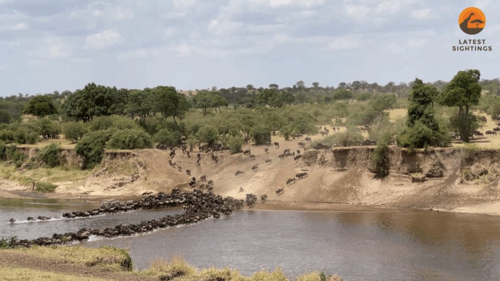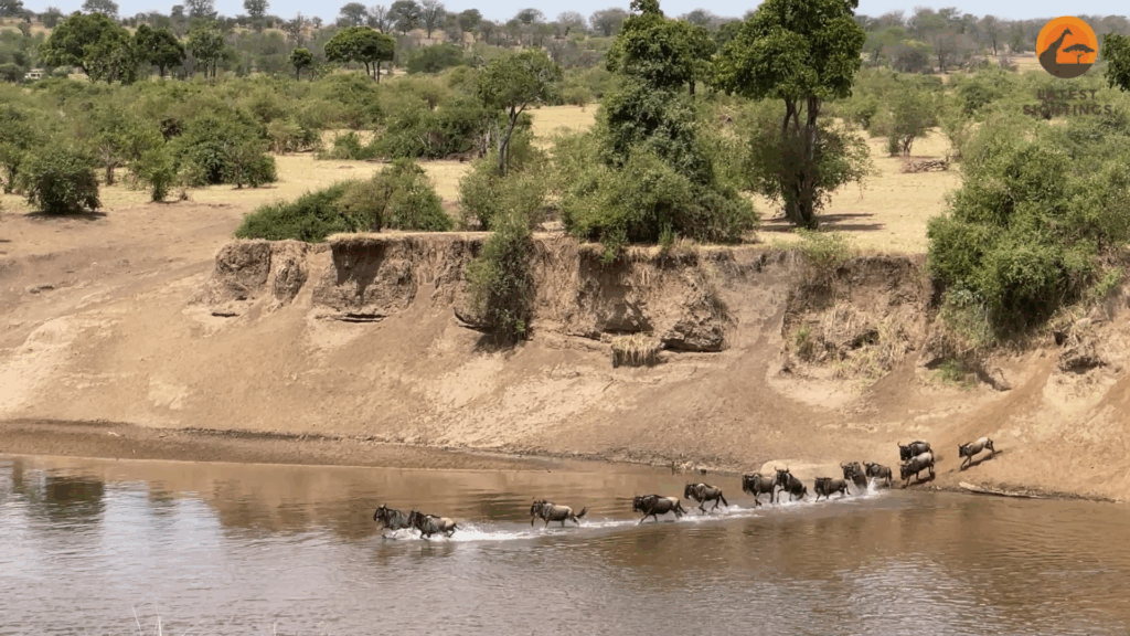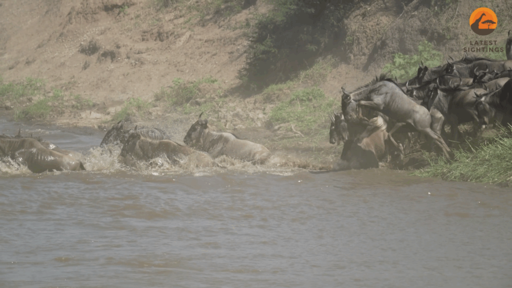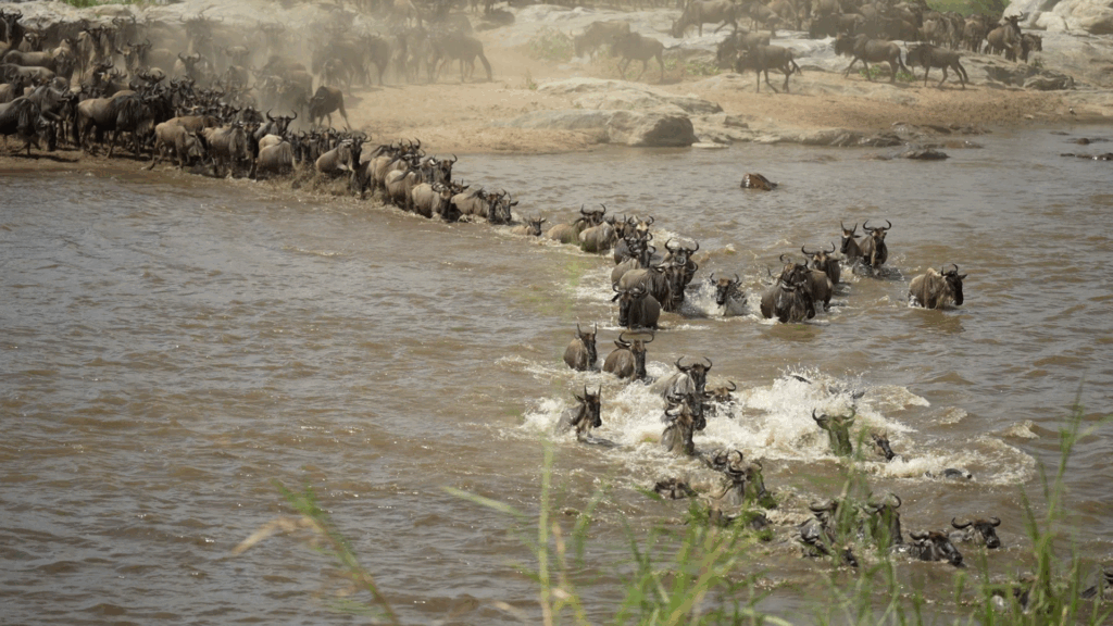 However, at this crossing point, the herd is lucky. For reasons unknown, there are no crocodiles present. The current may sweep some away, but the majority cross safely.