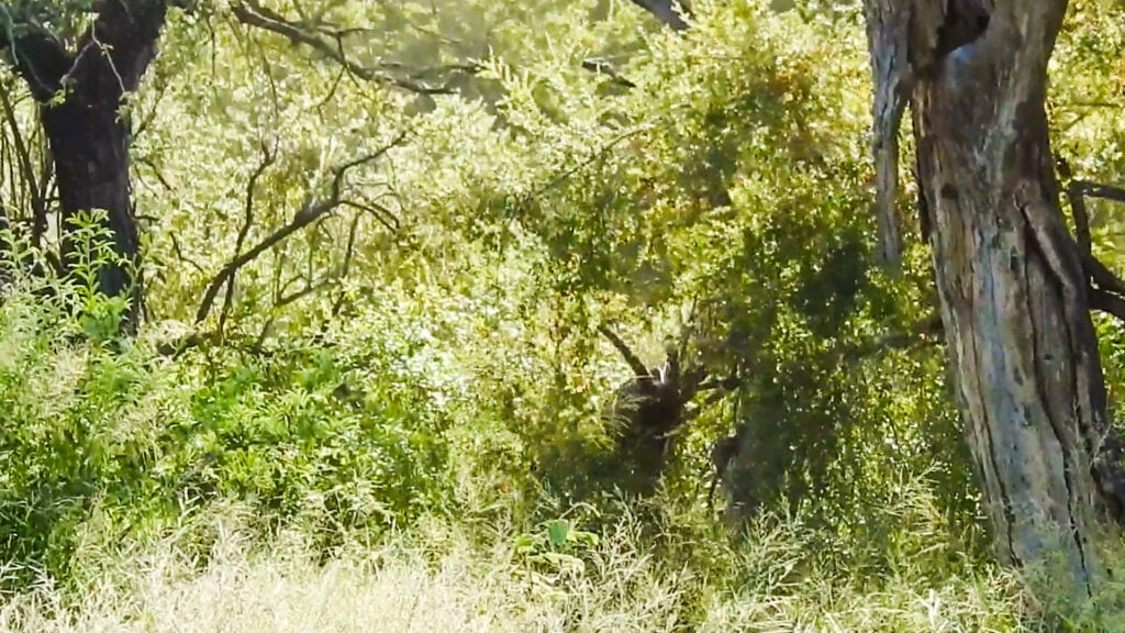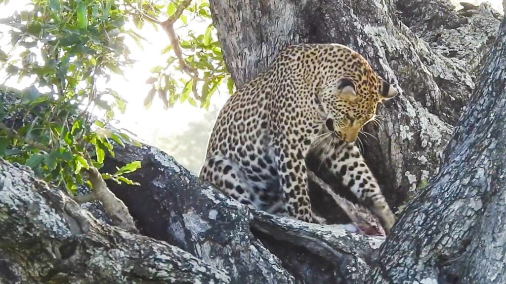 Trees also offer a secure space for young leopards, keeping them out of reach of ground predators like hyenas or lions. A leopard cub might use the moment to practice mock stalking or pouncing on a branch, much like it would on prey in the future.
