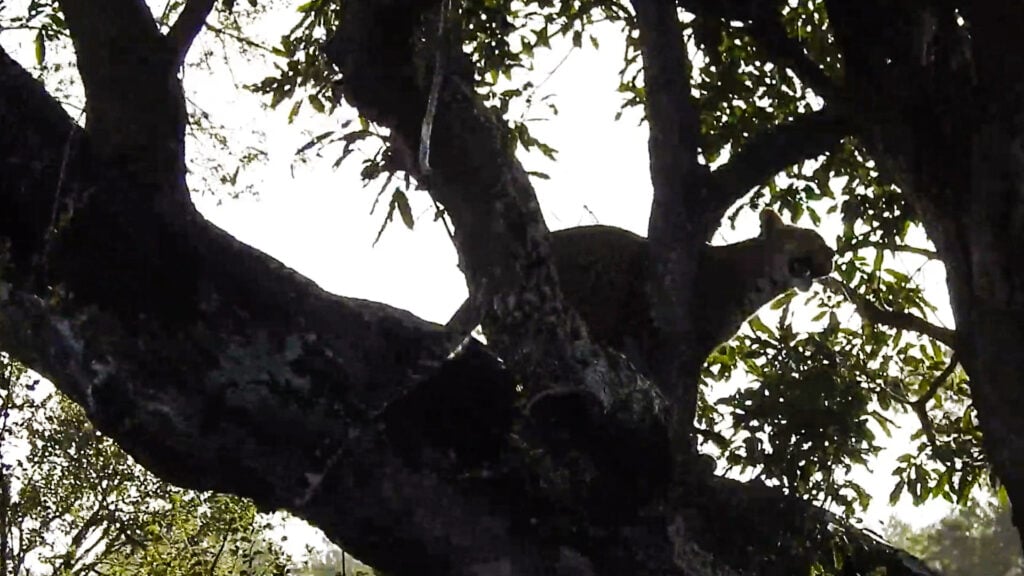 He climbed up into the branches until, to spectators, he became a mere silhouette high up in the foliage. His rosette spots kept him well camouflaged and it might’ve been easy to miss him there in the branches, had you not spotted him earlier, while he was scaling the trunk.