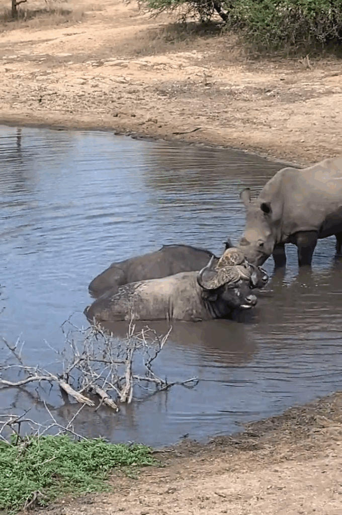 Jacques Schutte sighted this interaction between rhino and buffalo in the Kruger National Park and sent the footage into Latest Sightings. This young rhino was experimenting to discover its place in the natural pecking order.